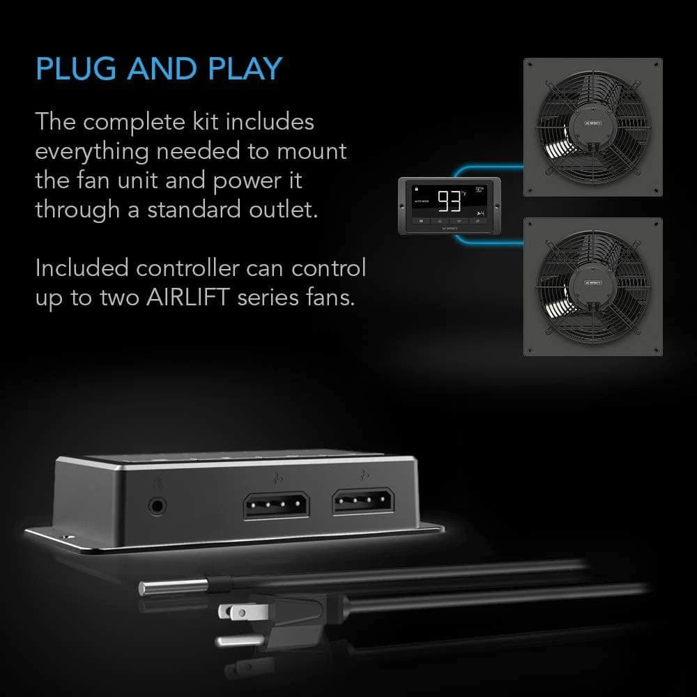 - Programmable controller with corded probe, can adjust fan speeds in response to temperatures and humidity