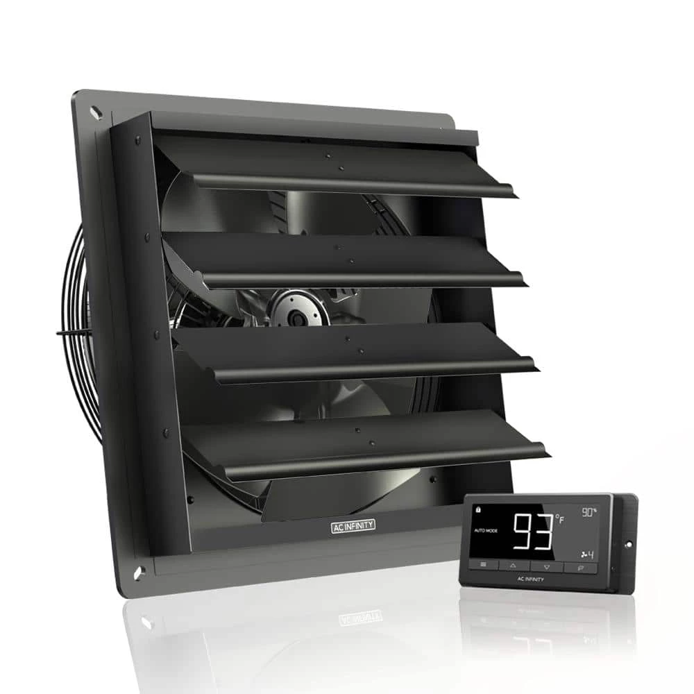 A high-airflow exhaust fan designed to cool and ventilate greenhouses, garages, attics, workshops and sheds. The system can automatically eliminate heat, moisture, odor, and dust from enclosures, rooms and buildings. Features an LCD display with remote smart temperature and humidity sensors, as well as customizable fan speeds. Innovative EC-motor with PWM-control maximizes airflow while reducing energy consumption and noise levels. Heavy-duty build features aluminum blades, steel wire guards and galvanized-steel shutters. Includes everything needed to mount the fan unit and power it through an outlet.