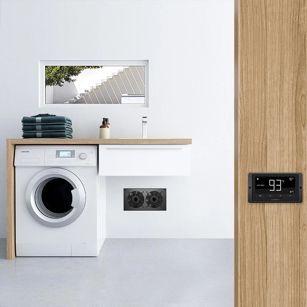 A high-airflow ventilator fan designed to control the temperature and humidity levels of your crawlspace, basement, attic, and garage. This system can also reduce humidity levels to prevent mold growth, while ventilating out odors and other harmful pollutants like Radon from your home. Fans are set to blow towards the mounting frame. Features an LCD display with smart thermostat and DE humidistat control, as well as customizable fan speeds. Heavy-duty build includes an anodized aluminum mounting frame and IP-44 rated fans. Features dual 120 mm PWM-controlled DC fans that are highly efficient in maximizing airflow at lower noise and power levels.