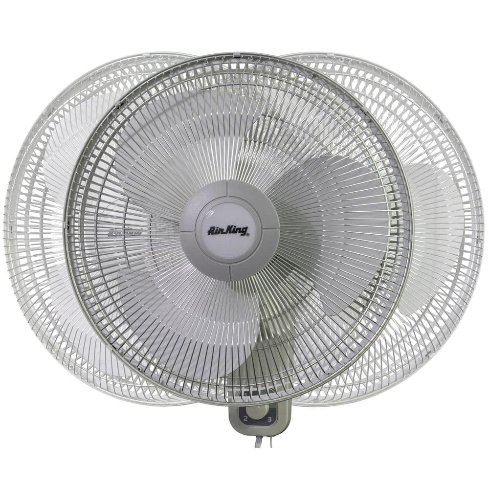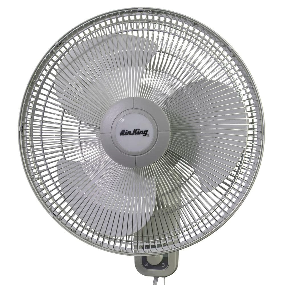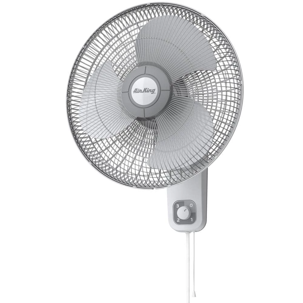 The Air King 9016 16-Inch 3-Speed Oscillating Wall Mount Fan is ideal for use in residential as well as commercial settings needing quiet airflow such as retail stores, fitness centers, salons, offices, meeting rooms, restaurants, schools or other areas with limited floor or table space. The commercial-grade wall mount fan is built with a powder-coated steel front grill for long-lasting durability and an impact resistant plastic rear grill. The table fan has 3-speeds and features a 1/20 HP motor with front mounted rotary controls and a 6 ft. white power cord. The pivoting fan head can be set to oscillate or locked in one position for directional airflow. The fan is ETL listed, OSHA compliant and features a 1-year limited warranty. Manufactured in the US using domestic and foreign parts.