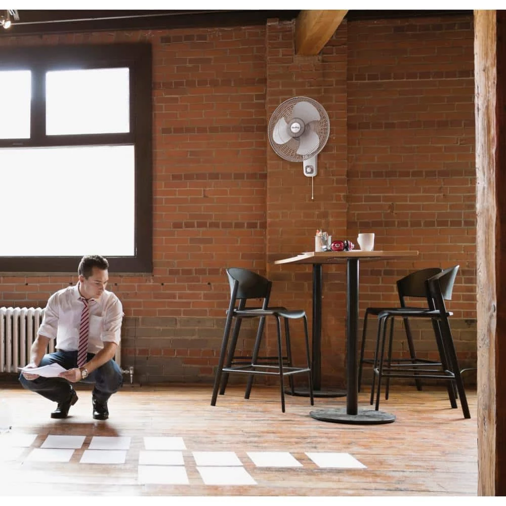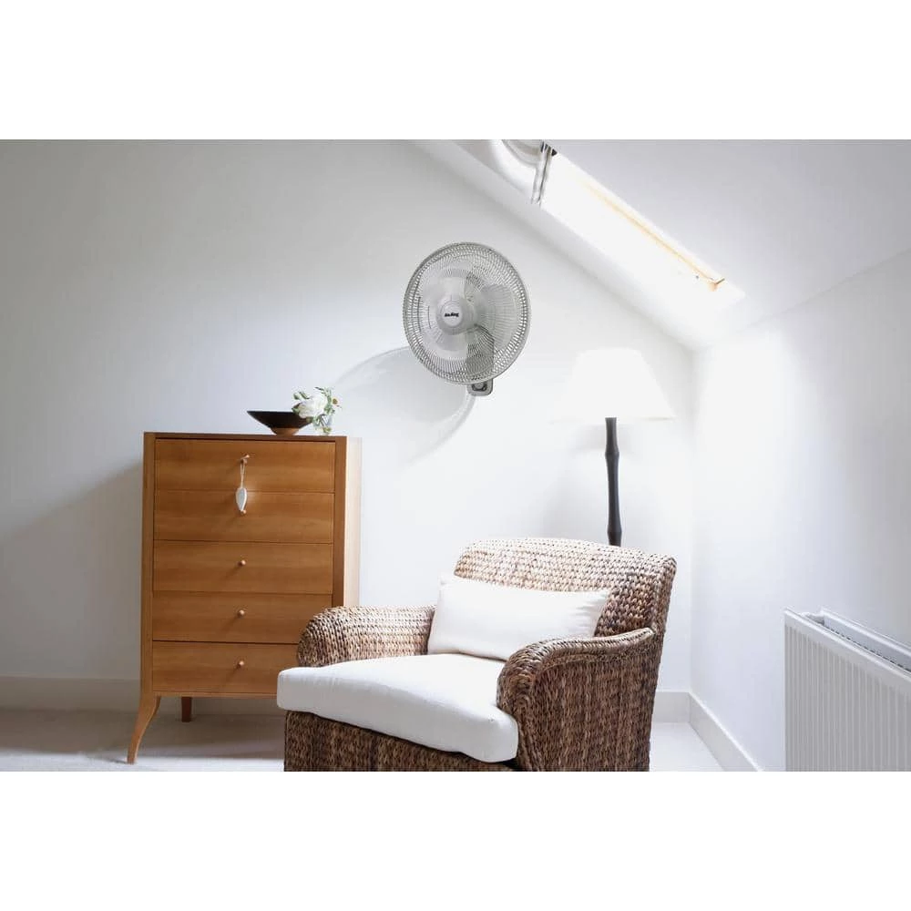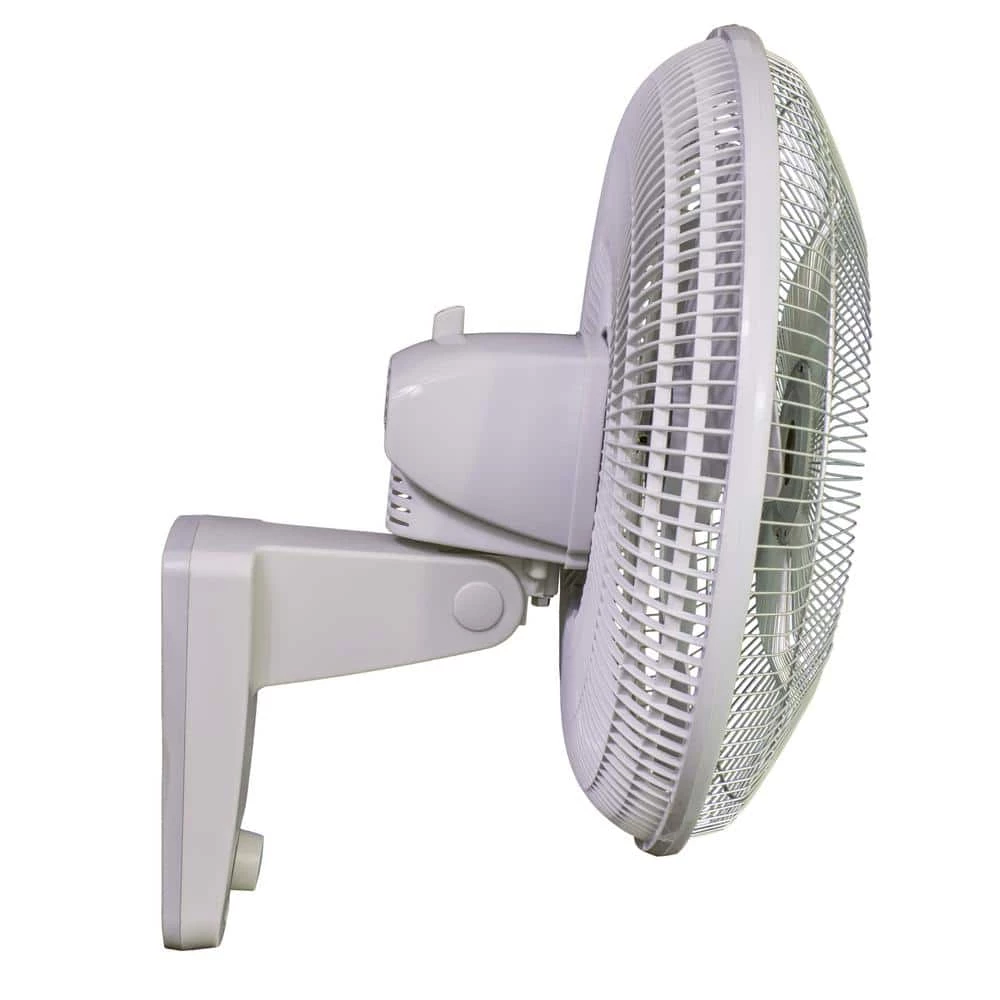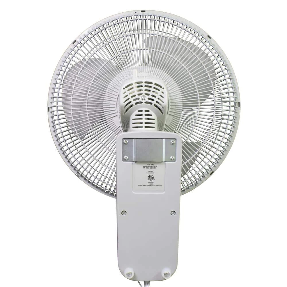 The Air King 9016 16-Inch 3-Speed Oscillating Wall Mount Fan is ideal for use in residential as well as commercial settings needing quiet airflow such as retail stores, fitness centers, salons, offices, meeting rooms, restaurants, schools or other areas with limited floor or table space. The commercial-grade wall mount fan is built with a powder-coated steel front grill for long-lasting durability and an impact resistant plastic rear grill. The table fan has 3-speeds and features a 1/20 HP motor with front mounted rotary controls and a 6 ft. white power cord. The pivoting fan head can be set to oscillate or locked in one position for directional airflow. The fan is ETL listed, OSHA compliant and features a 1-year limited warranty. Manufactured in the US using domestic and foreign parts.