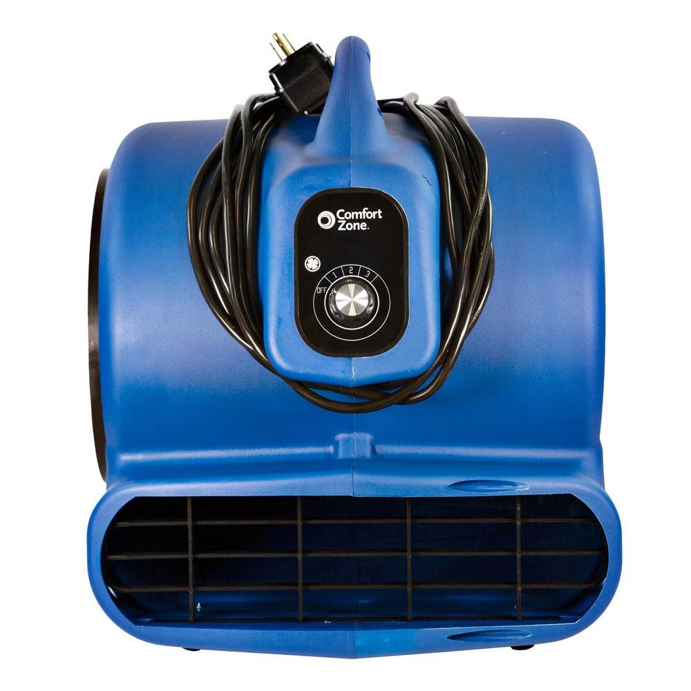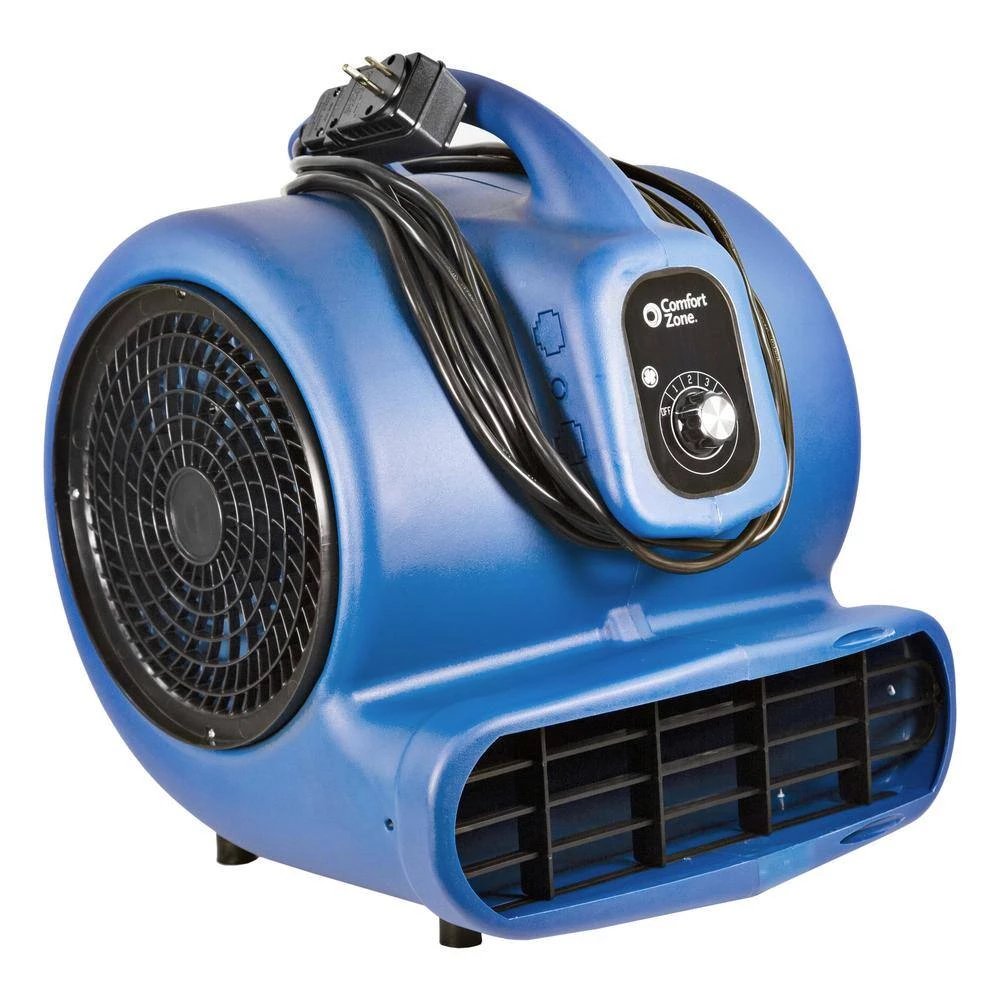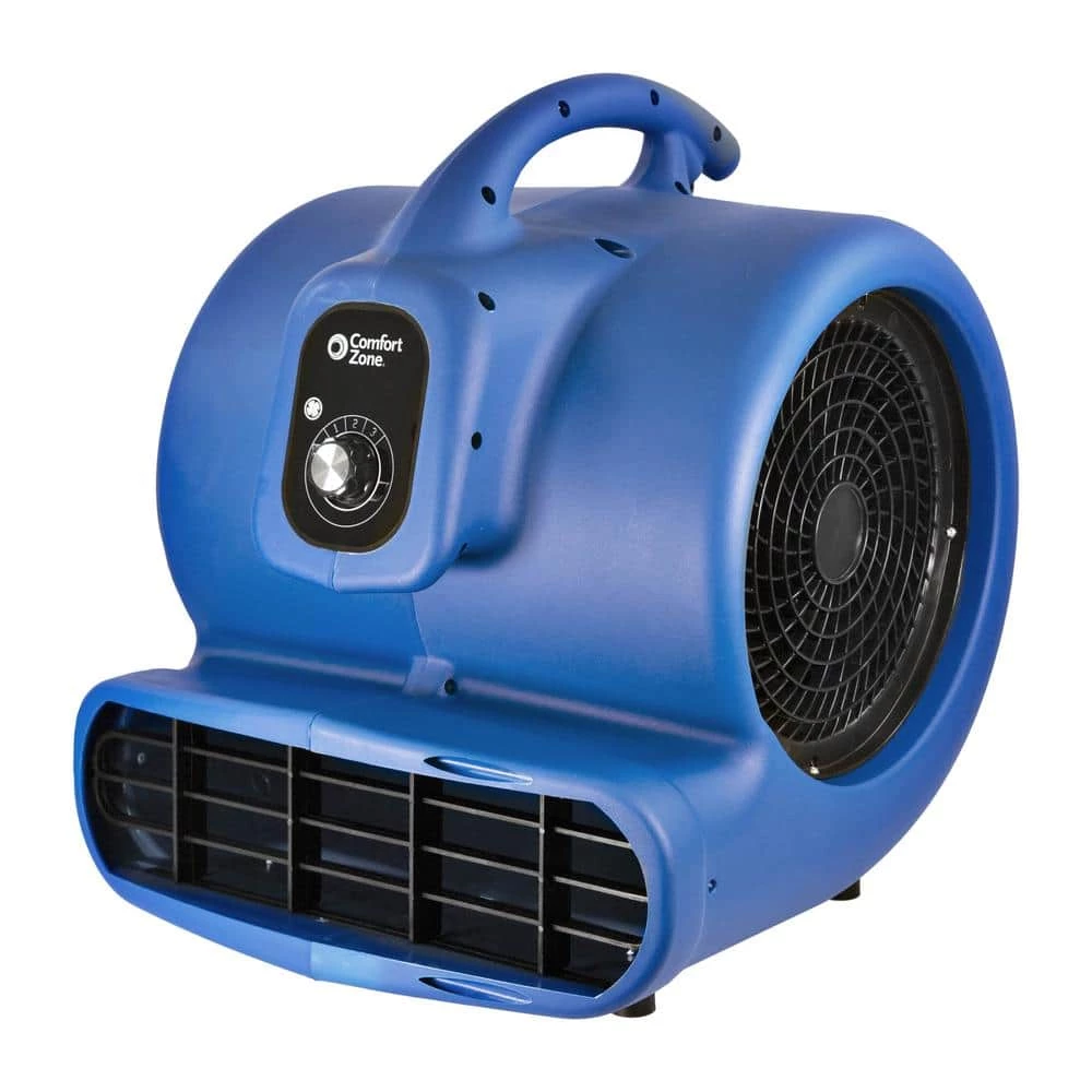 The Comfort Zone 1/3 HP High Velocity Air Mover is multipurpose floor fan perfect for drying out wet and damp spaces or providing general room air circulation. Perfect for residential and commercial use, this powerful air mover is ideal for use in crawl spaces, basements, attics or garages and contractor or service industry jobs, including construction, plumbing, painting, carpet cleaning and other janitorial services. It can help dry anything from floors with water damaged to carpet and floors that have just been cleaned to freshly painted spaces. with a convenient carry handle, this 1/3 horsepower air mover is easy to move around the room and features 3 air speeds with 3 adjustable angles helping to move and circulate air to dry your space quickly and efficiently. The Comfort Zone 1/3 HP high velocity air mover comes equipped with a GFCI plug that will automatically shut off power directly at the power source when it detects an electrical fault. It also comes with a wrap-around cord design and is stackable up to 4 high for easy, space saving storage.