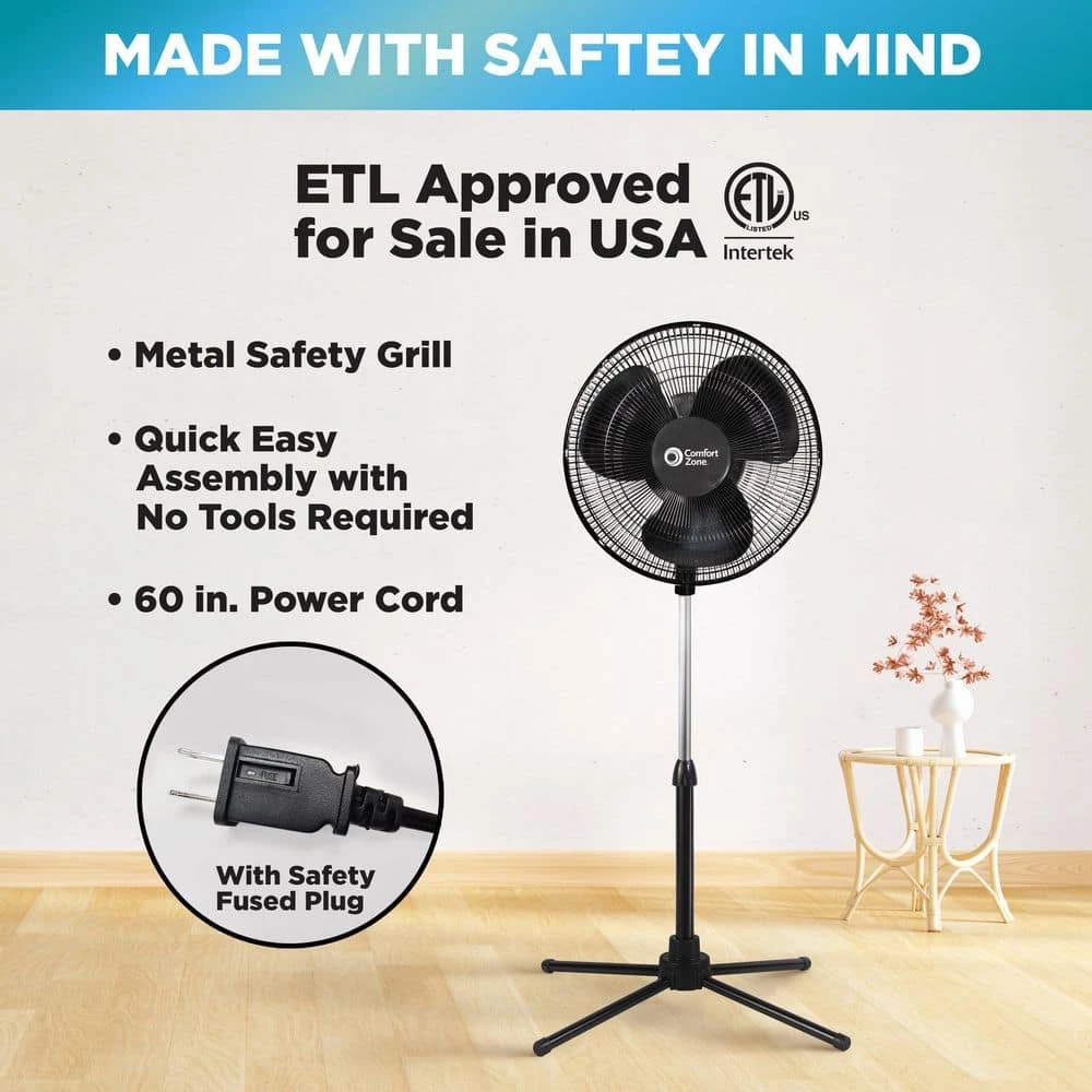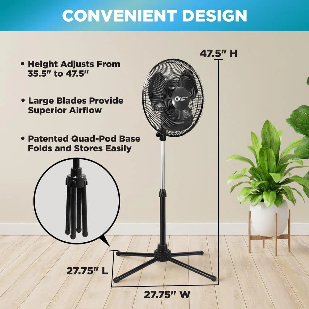The Comfort Zone 16 in. 3-speed pedestal fan provides strong air flow with its large blades and has a stand with an adjustable height up to 47 in. making it ideal for use in your home, office, or garage, helping create a cool, comfortable environment. With features like wide degree oscillation and an adjustable tilt, the cooling effect is easily expanded to reach all parts of the room and the quiet operation makes it perfect to use in any space. This Comfort Zone 16 in. 3-speed pedestal fan is equipped with a quick folding base making it easy to store anywhere when not in use.