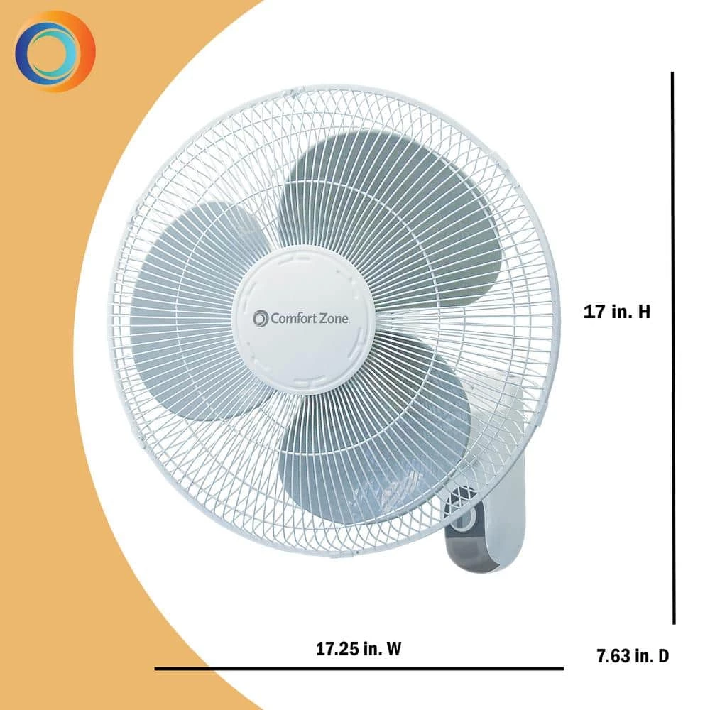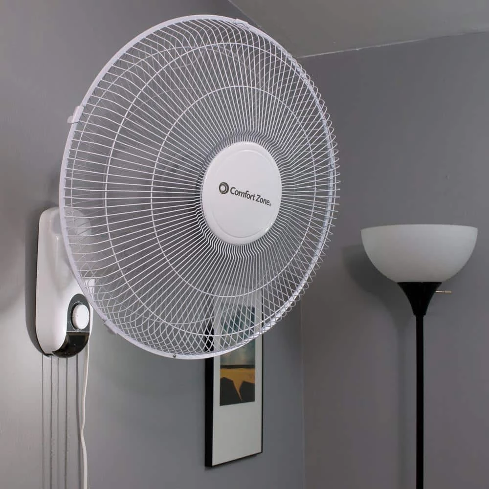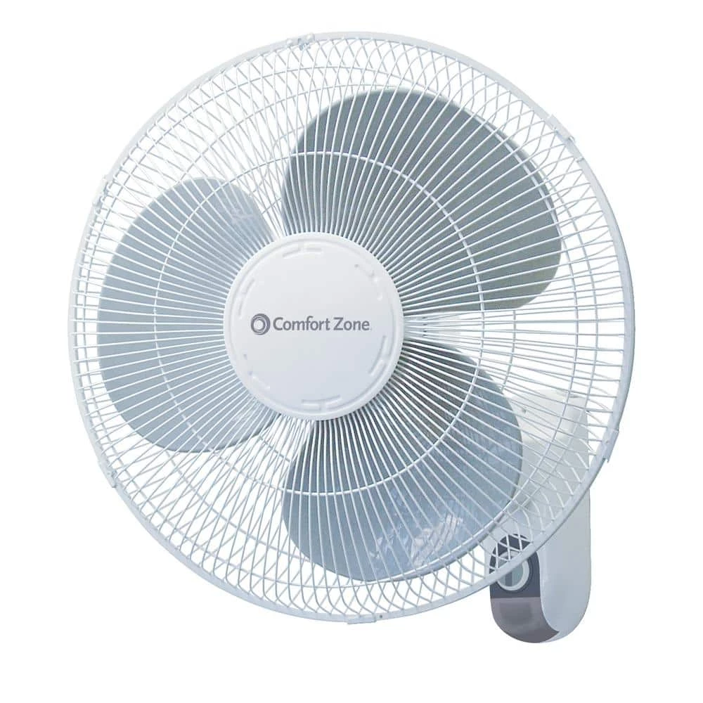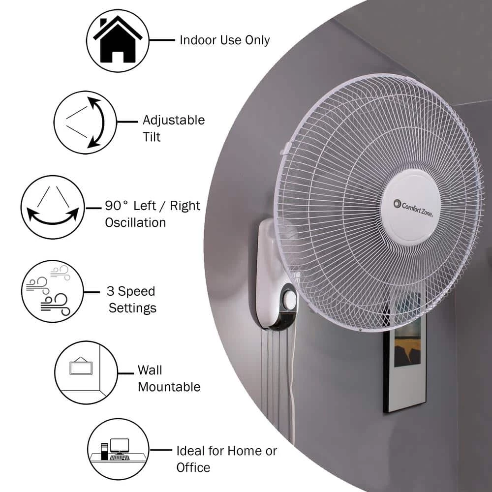 Use the Comfort Zone 3-speed wall-mount fan to keep your home, garage or studio a comfortable place to spend the day. The 16 in. oscillating fan offers three convenient output speeds, allowing you to easily adjust the airflow to fit the changing conditions in your space. The wall mount indoor fan can be tilted to direct the airflow exactly where you want it to go. You can focus the airflow in one area or use the oscillation feature to spread it in all directions and optimize air distribution. The fan features a sturdy protective metal grill over the blades for enhanced safety during operation. Durable metal construction helps the fan stand up to regular use year after year. Designed to be mounted on a wall, the 3-speed oscillating fan saves valuable floor and table space in smaller rooms. This model is designed for remote-less operation, so there is no need to worry about misplacing the controller one day. Simply give the control cords a quick pull to turn the fan on and off or to adjust its speed.