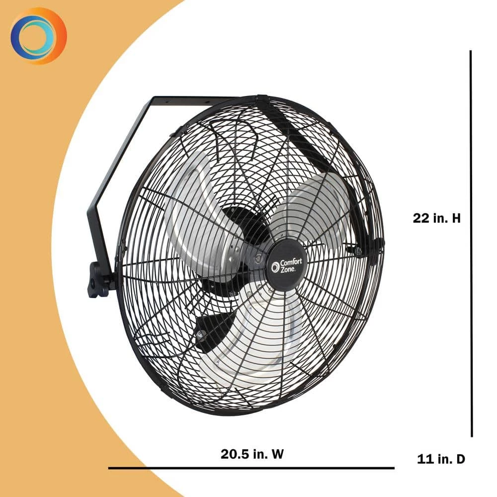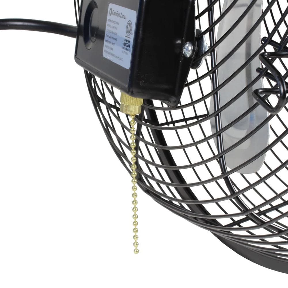 With this Comfort Zone 18 in. wall-mount fan, get increased control over airflow output to help keep air moving at the volume needed to keep your environment cool and comfortable. With its 3-speed control options, the industrial fan lets you select low-, medium- or high-velocity output for efficient air circulation and optimized airflow that suits any home, garage or work space. Equipped with a 360° angle adjustment, the high-power fan head can be adjusted and tilted to direct the flow of air exactly where you want it. Once you’ve found the ideal angle, integrated adjustment knobs lock the fan into place without the need for tools. You can easily unlock it and make further adjustments to meet changing conditions or needs. The all-metal wall-mount fan with individually balanced aluminum blades features solid construction and a heavy-duty motor that has fully sealed bearings for durability and lasting performance. Its black finish has a neutral look that fits in with any interior setting. Offering versatile installation, the wall-mounted circulating fan can be mounted on the ceiling or mounted on the wall to suit your space. A metal cage protects fingers and hands from accidentally getting close to the blades, and changing speeds or turning the wall fan on or off is easy with the convenient pull chain that ensures quick and easy operation.