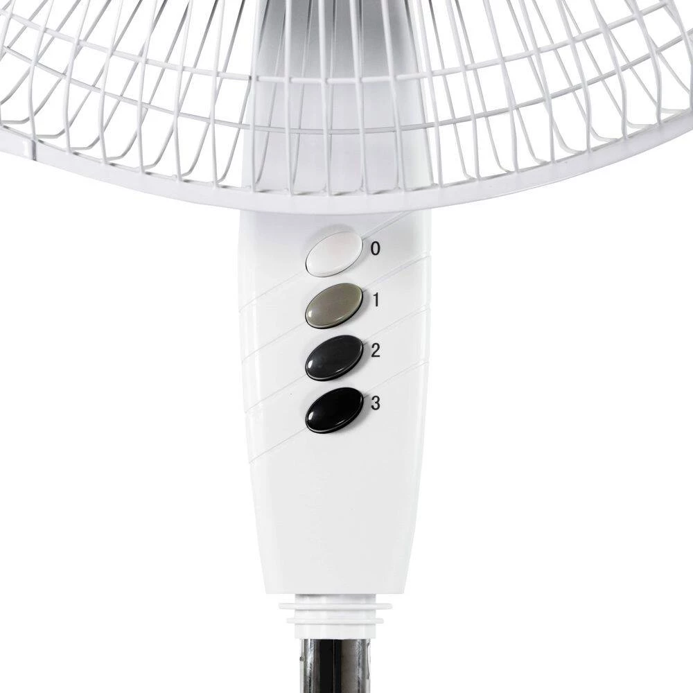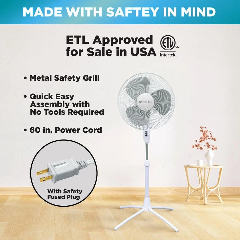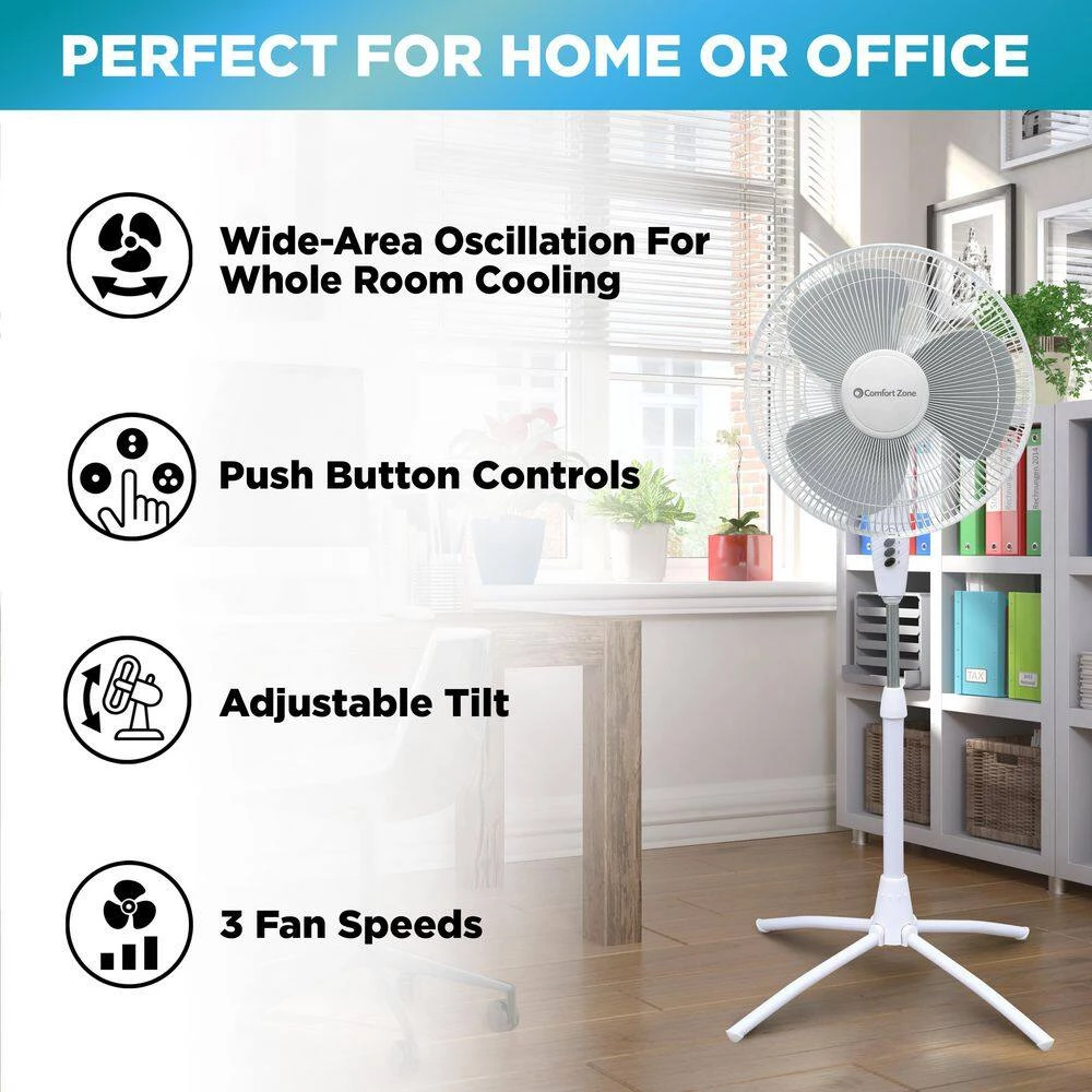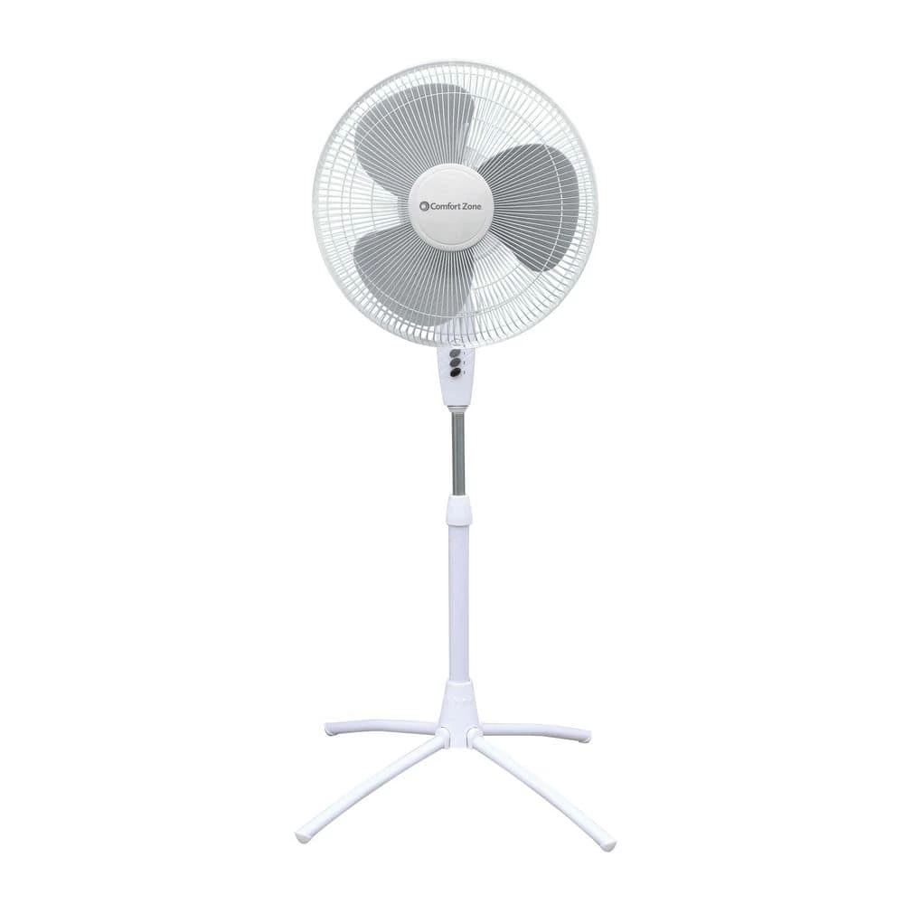 Add targeted cooling and air circulation to any room with the Comfort Zone 3-speed oscillating pedestal fan. This practical fan features three speed settings, allowing you to easily adjust the airflow to suit your space with the press of a button. The fan is easily tilted to direct the airflow exactly where you want it to go. The height of the stand can be adjusted from a minimum of 45 in. to a maximum height of 52 in., allowing you to adapt it to different settings and situations with ease. The 3-speed pedestal fan offers a practical oscillation function that allows it to cool and enhance air circulation in all directions. Designed with powerful large blades for superior airflow, it’s ideal for keeping larger rooms and groups cool when it’s hot and humid outside. The fan operates quietly, making it a smart choice for a wide variety of different settings and applications. A sleek pedestal fan for office or home use, it comes in a classic white finish that complements a wide range of decor styles with ease. The 3-speed portable fan is designed with a patented Quad-Pod base that comes pre-assembled for quick and easy setup. This unique base is designed to fold down, making it a snap to move around from one room to another or to put into storage during the winter.