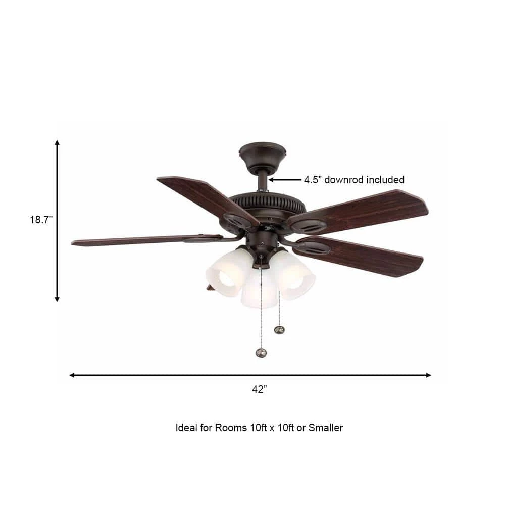 Enjoy beautiful lighting with just the right brightness with this 42 in. Glendale Oil Rubbed Bronze Ceiling Fan. The 3-light kit with frosted glass is a perfect size for smaller bedrooms. Also included are (3) 9.5-Watt, energy efficient LED bulbs. This fan also comes with a lifetime motor warranty for peace of mind.