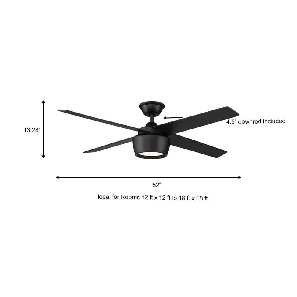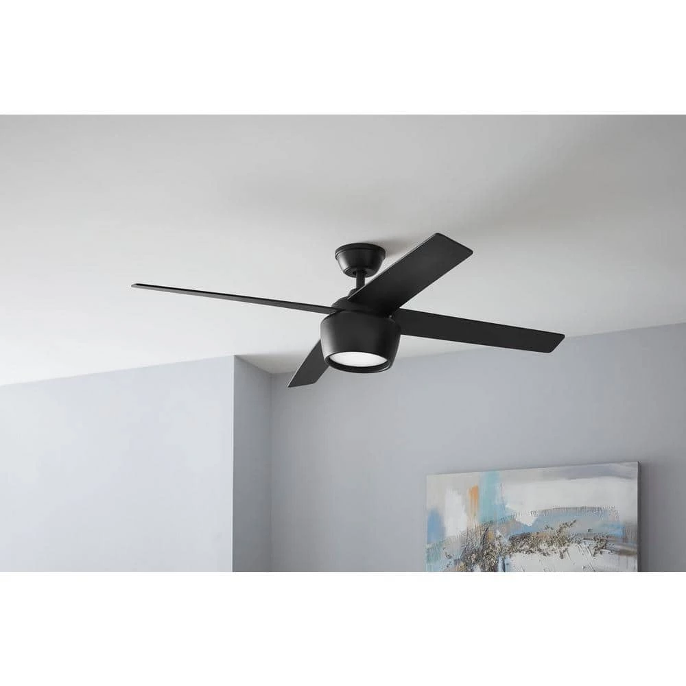 The Hampton Bay Havenstone 52 in. Matte Black Ceiling Fan offers 4 reversible matte black/brazilian walnut blades to give you 2 versatile design options to help match your interior decor. The integrated LED light kit provides soft white light. The included remote controls the dimming and speed functions.
