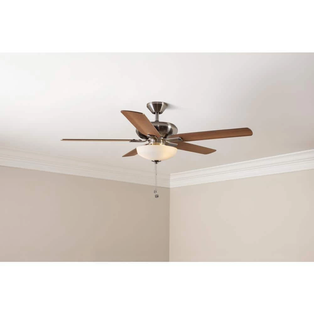 The Hampton Bay 52 in. Holly Springs ceiling fan is designed to provide ample airflow while complementing many indoor decor trends. The Holly Springs features QuickFit technology like a slide-on mounting bracket, QuickInstall blades, and AccuArm blade arms to make installation quick and easy. The light kit includes three LED bulbs which last longer and use less energy than CFL or incandescent bulbs. This fan can be installed with or without the light kit.