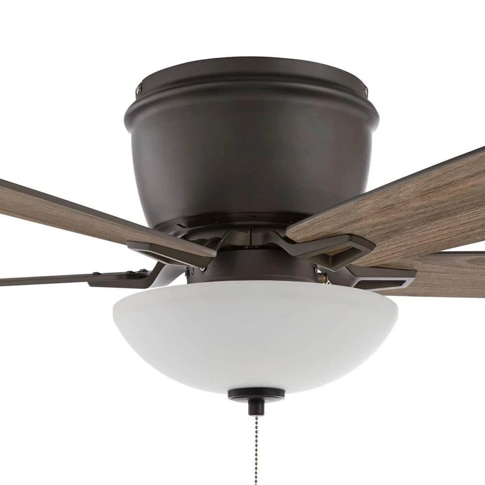 Sleek transitional styling and modern technology are combined to form the 52 in. Melrose ceiling fan by Hampton Bay. This hugger style fan is perfect for large rooms with low ceilings. The rich, bronze finish is paired with 5 reversible blades in weathered wood and mahogany finishes to blend with your interior decor. The light kit features a frosted white glass bowl and uses two 8.5-Watt LED bulbs (included). Installation is a breeze with QuickFit features like a slide-on mounting bracket and Accu-Arm blade brackets.