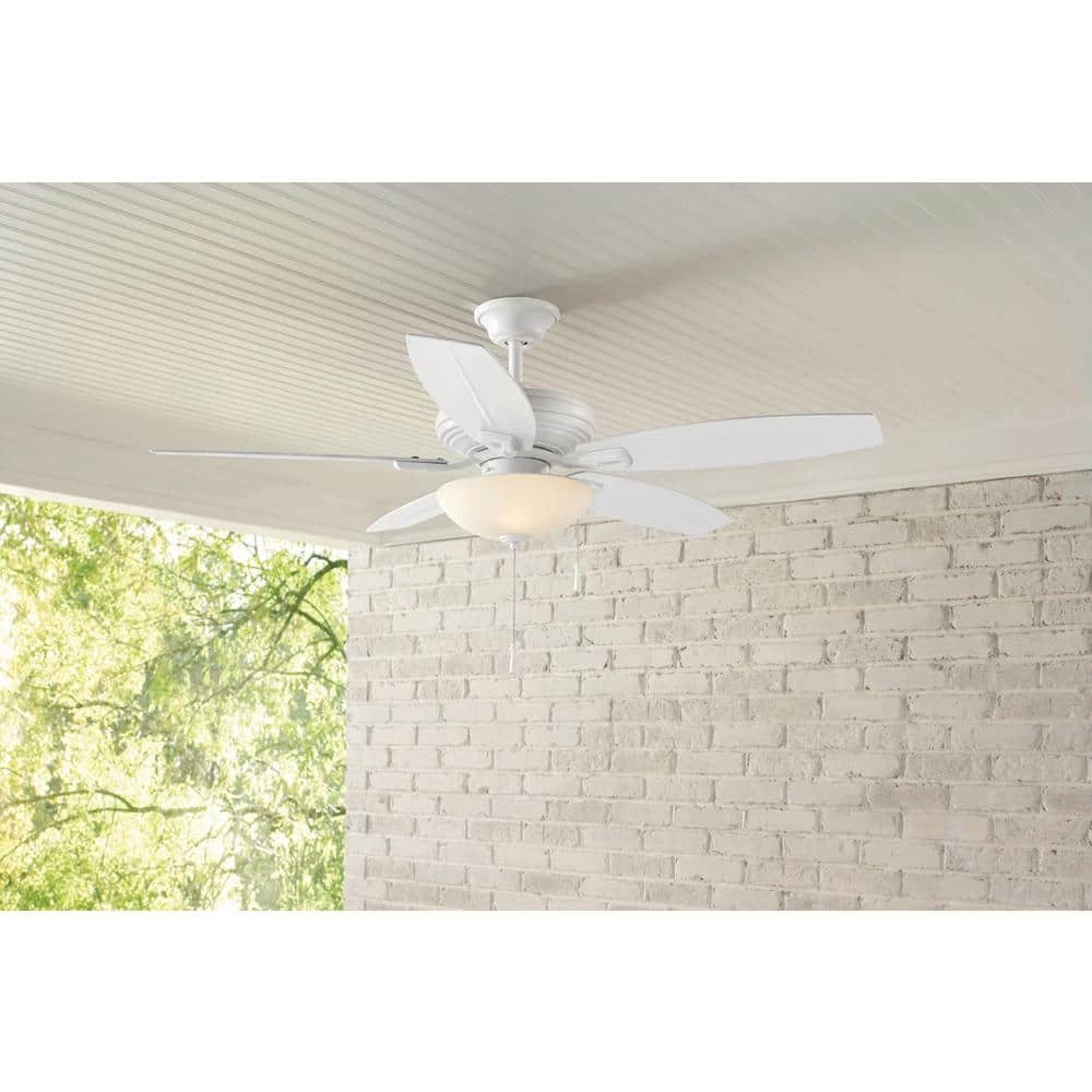 The Hampton Bay 52 in. North Pond outdoor ceiling fan is designed to enhance your outdoor living spaces and withstand the outdoor elements. This wet rated fan can be installed in any outdoor setting and will complement many of today’s outdoor decor trends. The powerful 3-speed reversible motor allows for optimal airflow during warm or cool weather. Utilizing QuickFit technology, the North Pond installs quickly with included features like the slide-on mounting bracket, AccuArm blade arms and QuickInstall blades. The included light kit features a frosted white glass bowl and uses two 9-Watt LED bulbs (included).