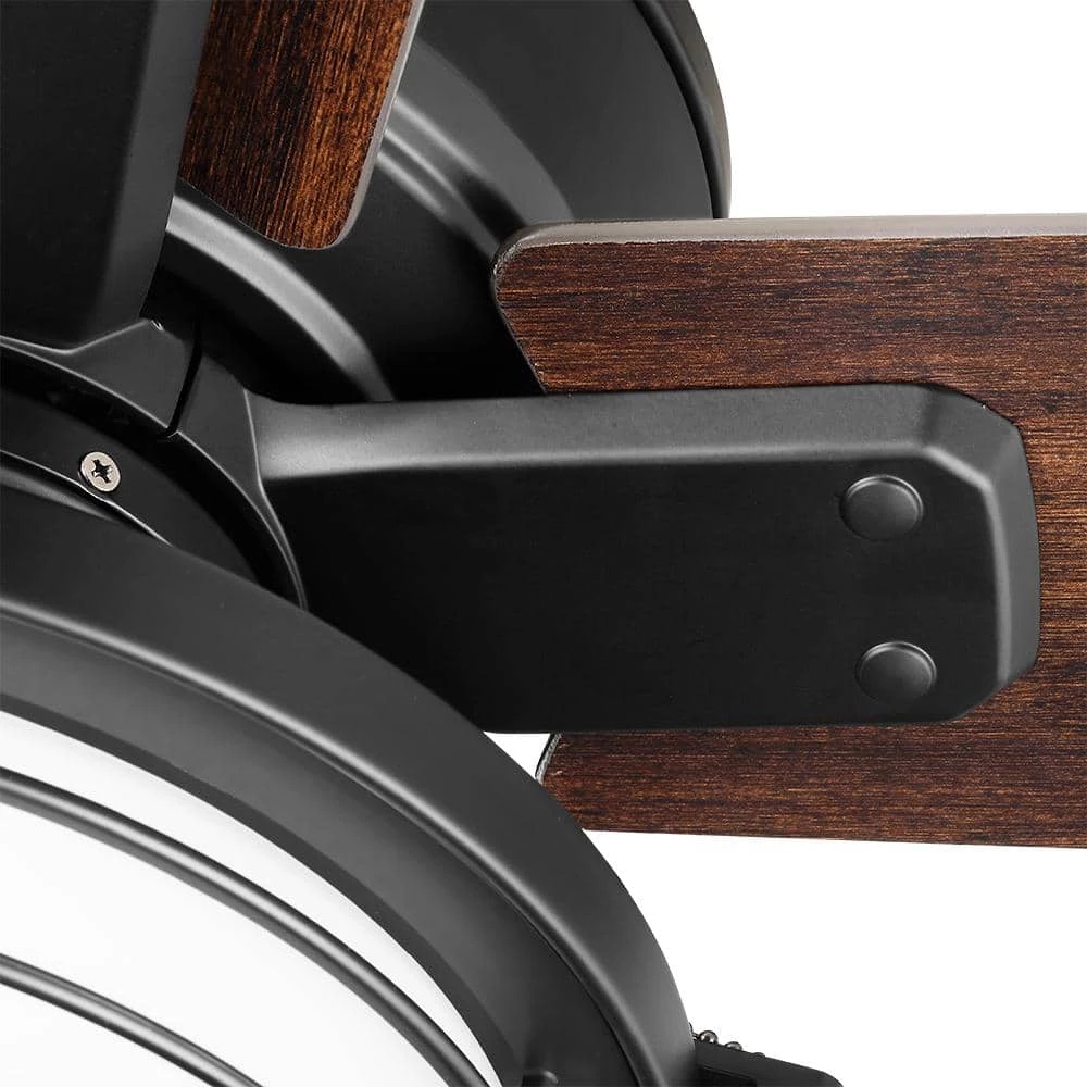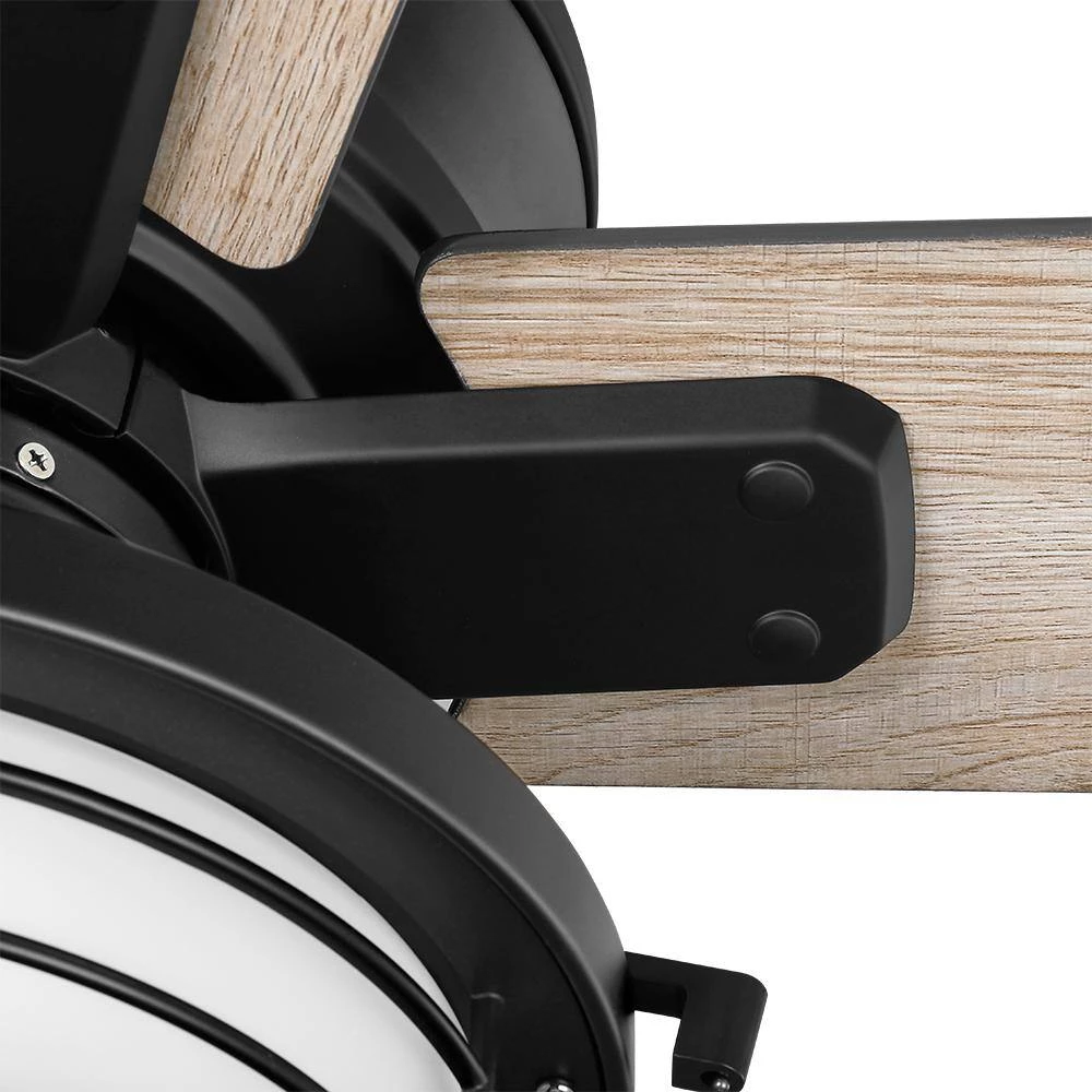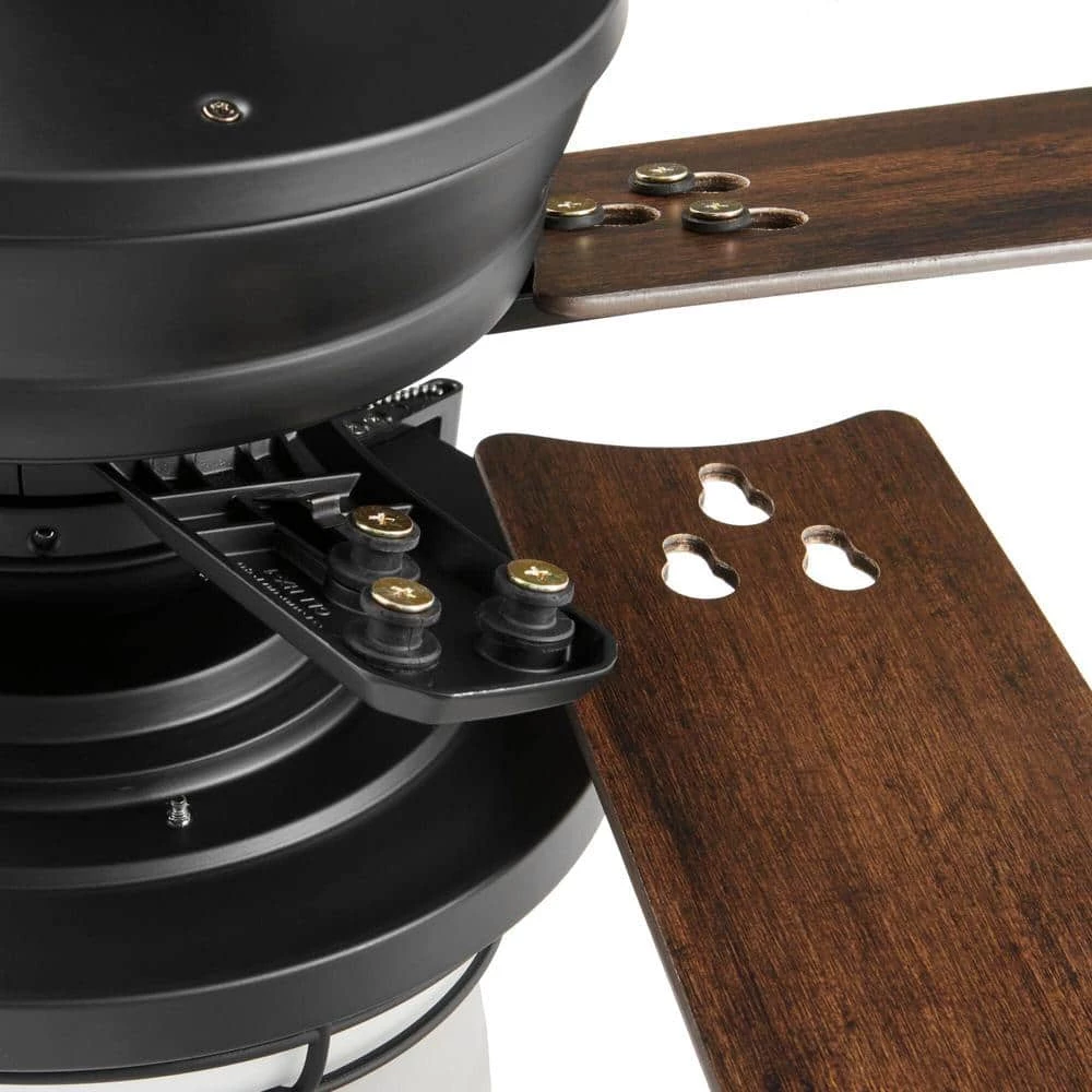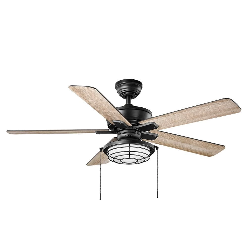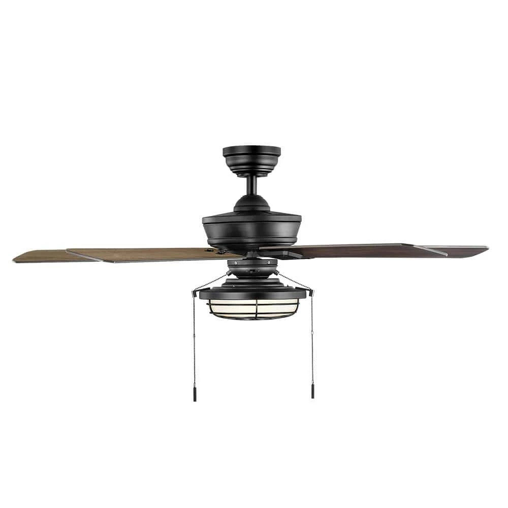 Add a touch of nautical design to your living space with the 52 in. Norwood ceiling fan by Hampton Bay. The fan’s versatile matte black finish is complemented by 5 reversible blades in wenge and natural aged oak finishes to blend with many of today’s decor trends. The light kit features a frosted white glass shade and decorative cage to complete the look. Installation is a breeze with QuickFit features like a slide-on mounting bracket, Accu-Arm blade brackets, Twist and lock glass and QuickInstall blades. The fan is conveniently controlled with the included pull chains. Designed for large rooms up to 324 sq. ft. and covered outdoor spaces like porches and patios (damp rated). The light uses two 8.5-Watt LED bulbs (included).