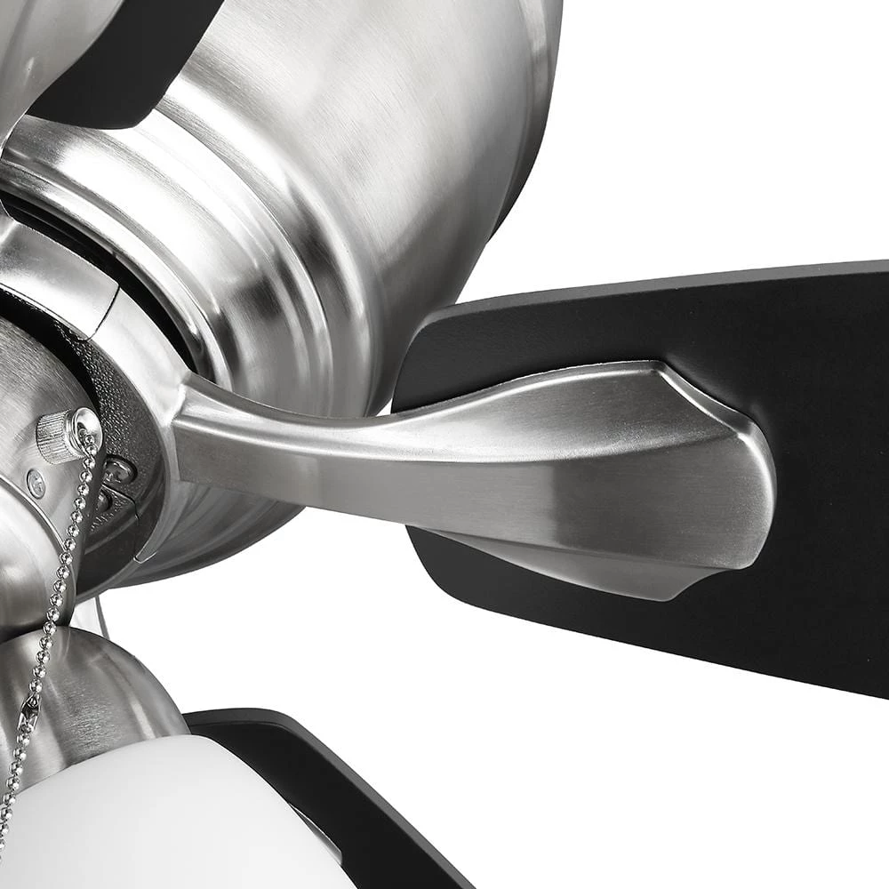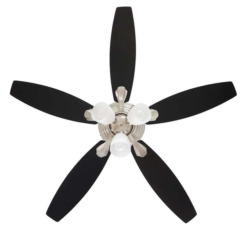Make a room cooler with this Hampton Bay Sidlow 52-in. LED ceiling fan. Designed for large rooms indoors, it offers five reversible wenge and walnut blades. For versatile lighting options, it provides a light kit with three LED bulbs. To make installation easy, it includes QuickInstall blades and a slide-on mounting bracket. A brushed nickel finish and white shatter-resistant light shades complete the traditional look.