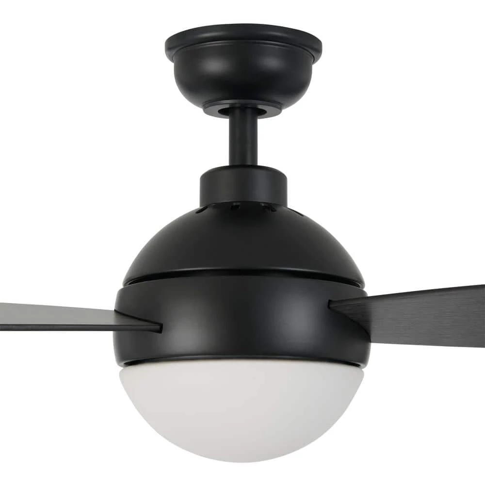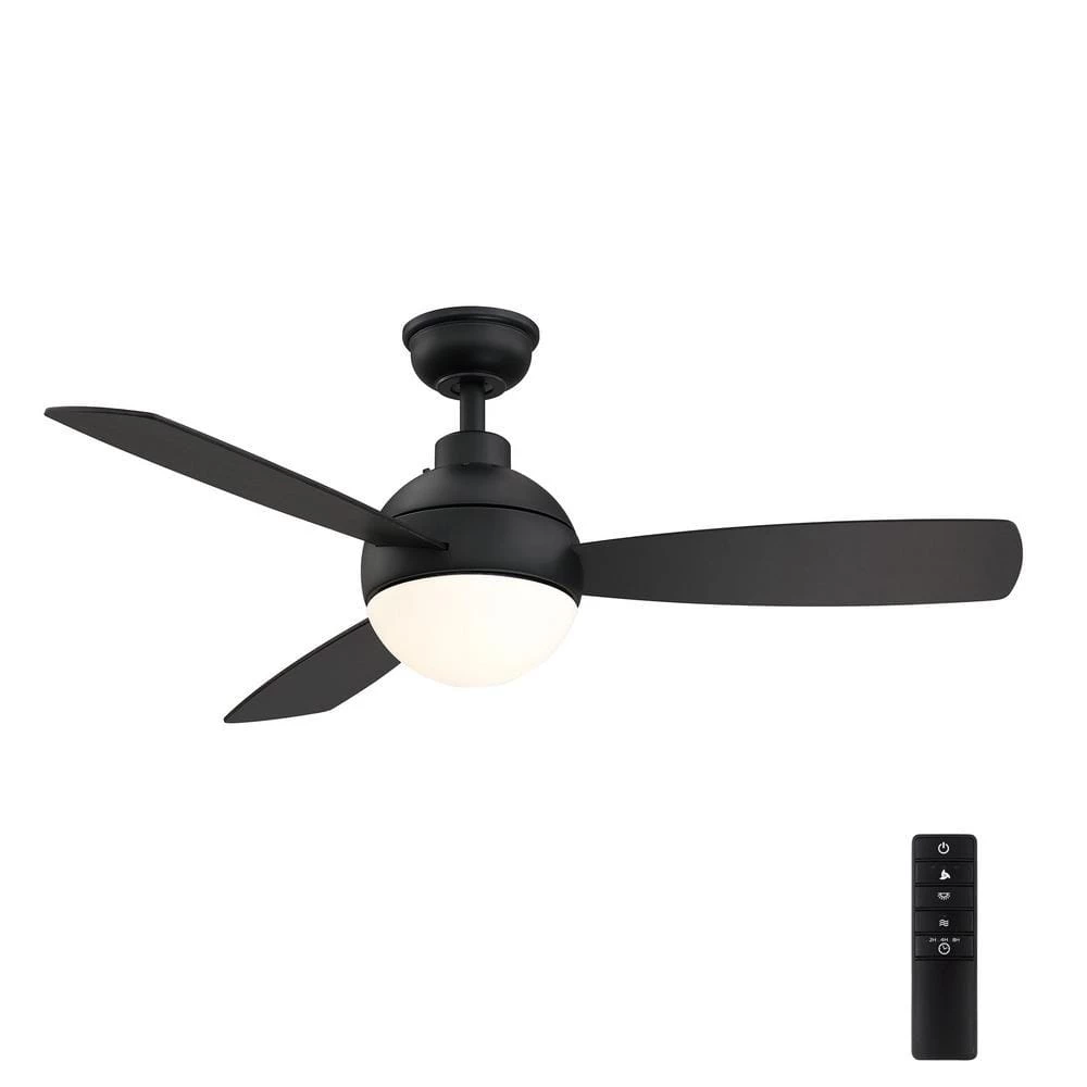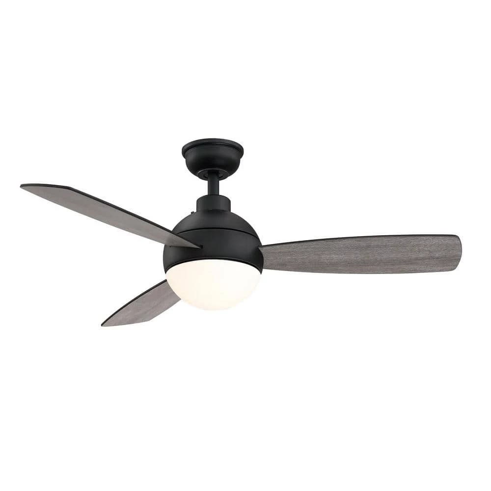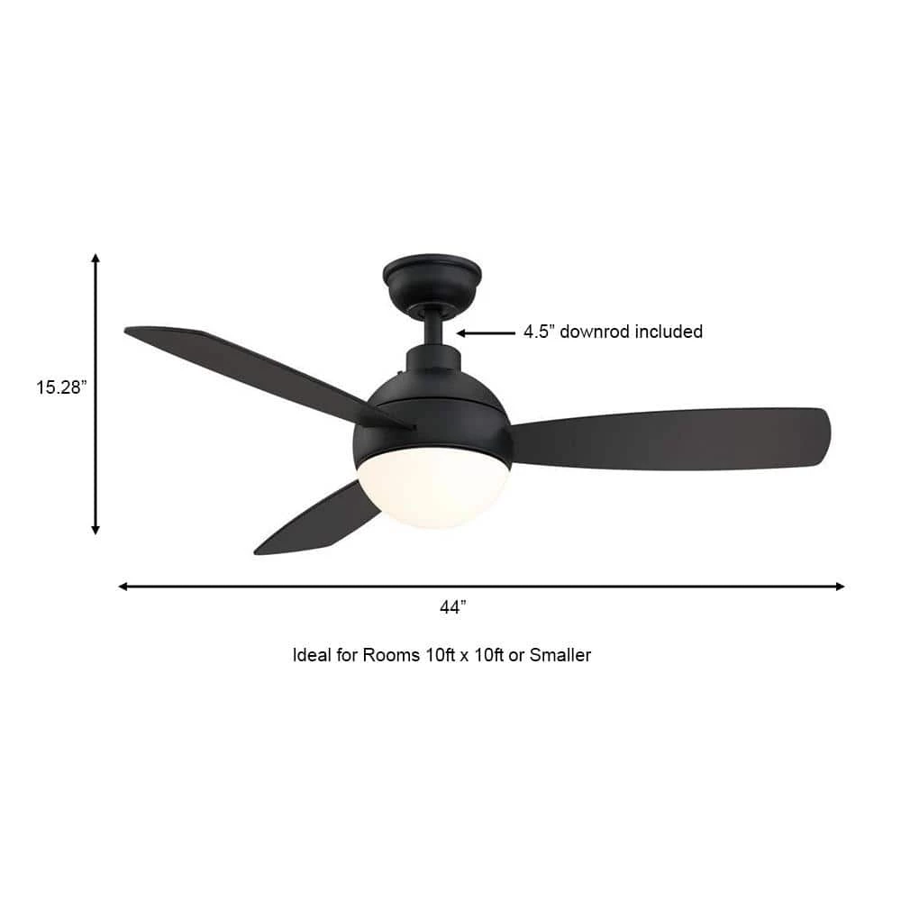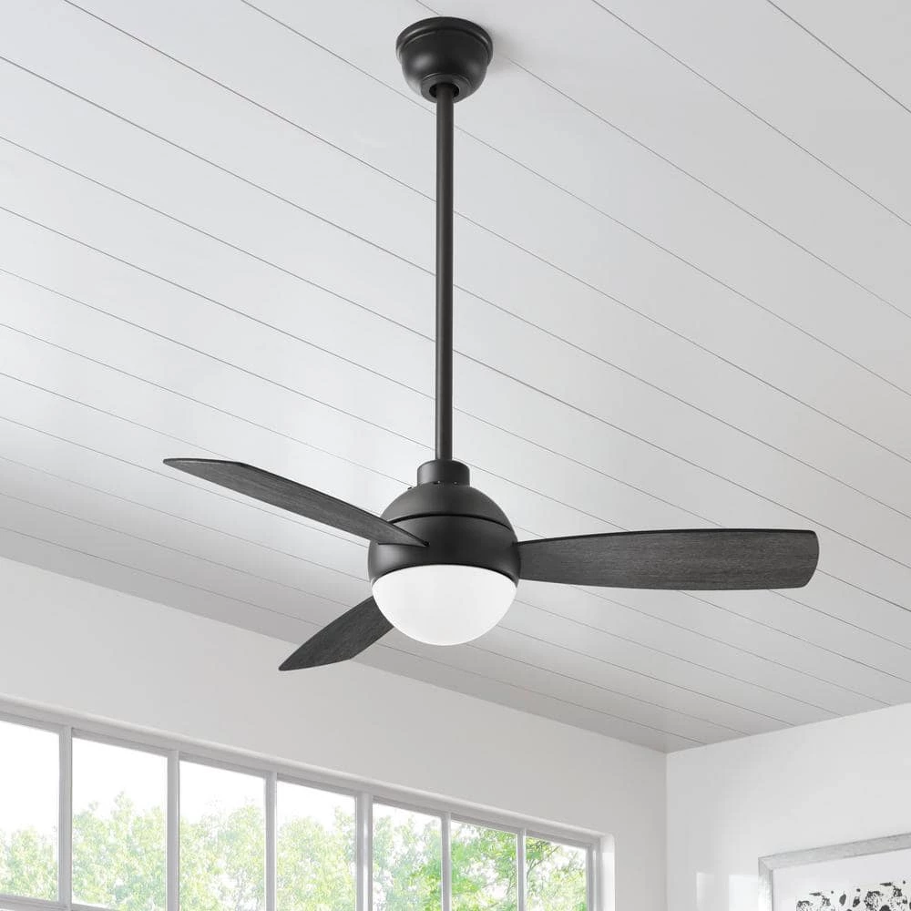 Add a classic touch to your space by installing this Alisio 44 in. LED Matte Black Ceiling Fan with Light and Remote Control. The fan boasts reversible black/graphite oak plywood blades, remote control operation and integrated LED technology. Prepare to cool off your indoor space with this stylish fan featuring three mounting options and frosted opal glass. Style and functionality come together with this fan considering its 4,304 CFM airflow and modern style.