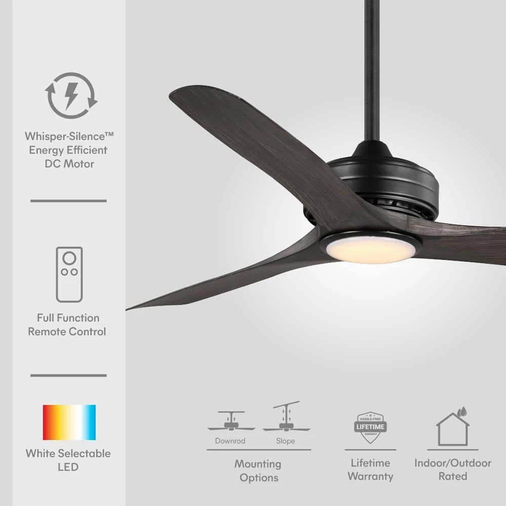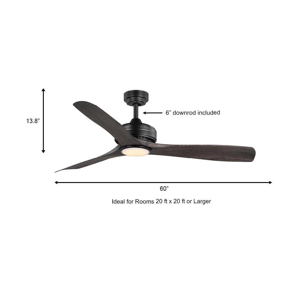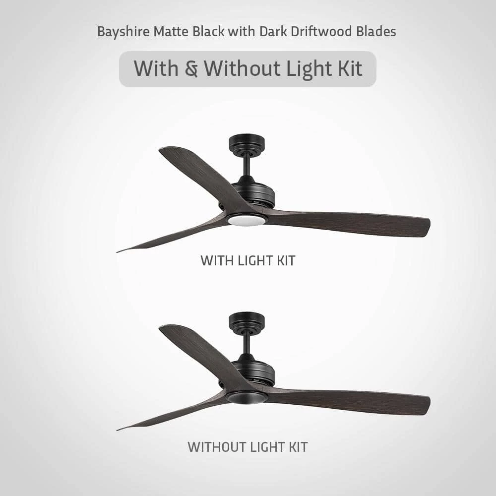 The Bayshire 60-inch matte black ceiling fan with a light makes an elegant addition to any room in your home, or install it as an outdoor patio ceiling fan. With 3 hand-painted dark driftwood ABS blades and 6-speed DC motor, it is designed to maximize your comfort in all four seasons inside your home or outdoors. The energy-efficient LED shines 800 lumens using only 18 watts. Change the mood of a room using the remote control to dim the light and select 3000K warm white light, 4000K bright white light or 5000K daylight. DC motor fans are 70% more energy efficient than AC motor fans (when comparing efficiency (CFM/W) of DC vs AC motors in published FTC Energy Guides for ceiling fans).