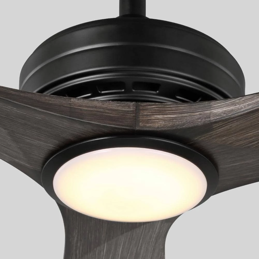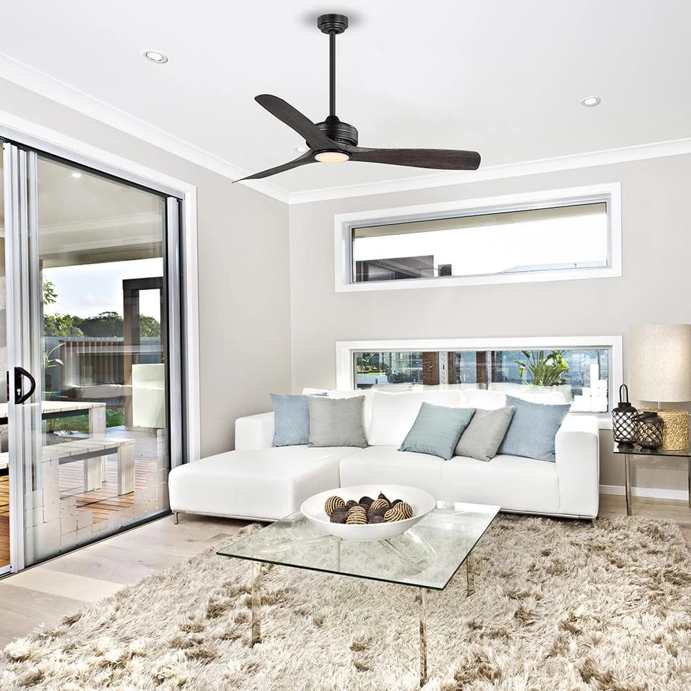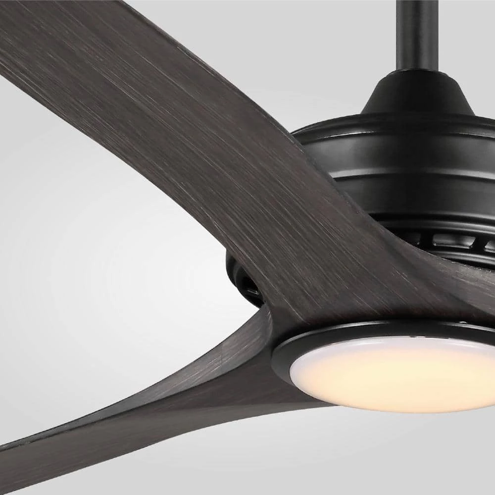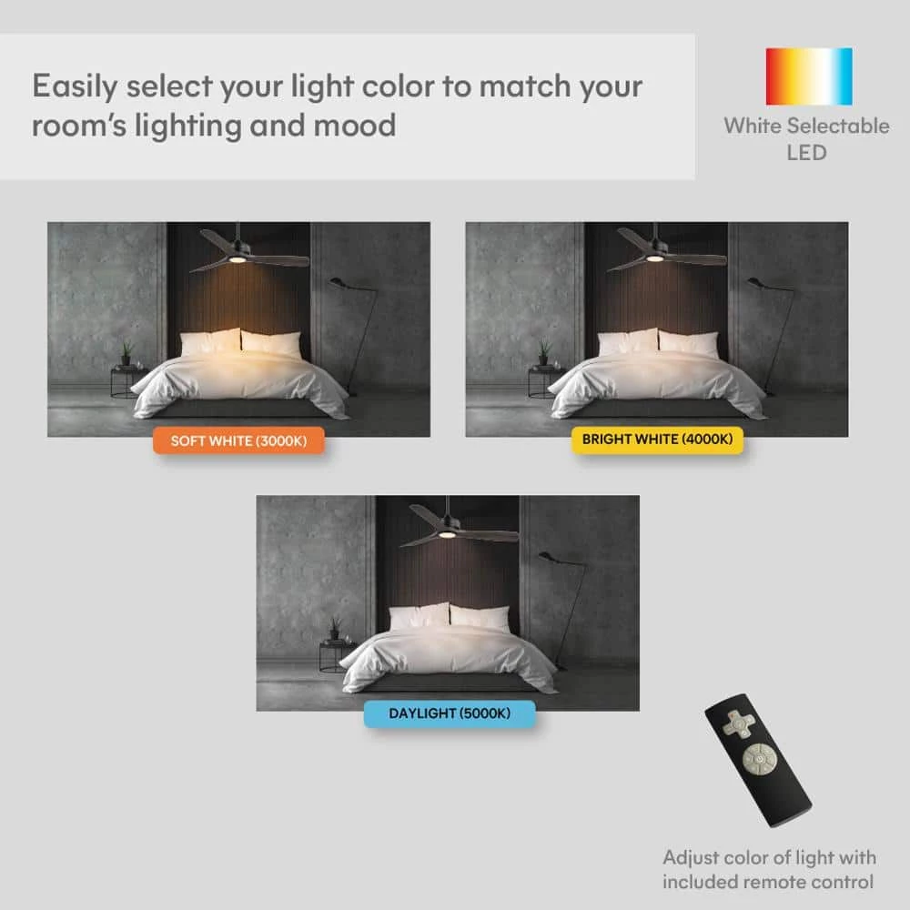The Bayshire 60-inch matte black ceiling fan with a light makes an elegant addition to any room in your home, or install it as an outdoor patio ceiling fan. With 3 hand-painted dark driftwood ABS blades and 6-speed DC motor, it is designed to maximize your comfort in all four seasons inside your home or outdoors. The energy-efficient LED shines 800 lumens using only 18 watts. Change the mood of a room using the remote control to dim the light and select 3000K warm white light, 4000K bright white light or 5000K daylight. DC motor fans are 70% more energy efficient than AC motor fans (when comparing efficiency (CFM/W) of DC vs AC motors in published FTC Energy Guides for ceiling fans).