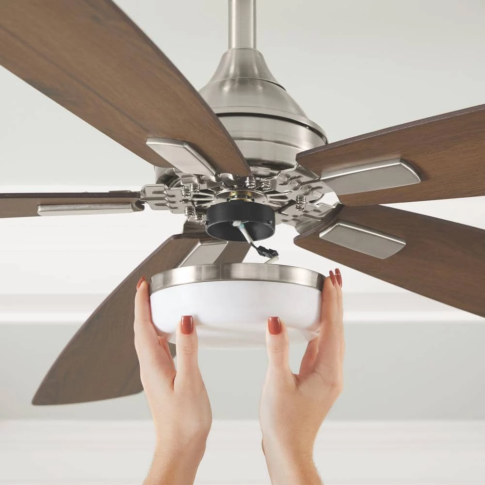 The Home Decorators Collection 52 in. Brushed Nickel Ceiling Fan offers reversible tea stained oak/oil rubbed oak blades. The integrated LED light kit offers versatile lighting options. Choose from 3,000K, 4,000K or 5,000K light output options all conveniently controlled with the included remote control.