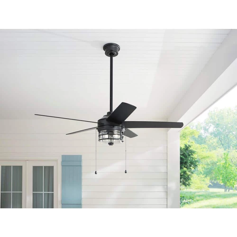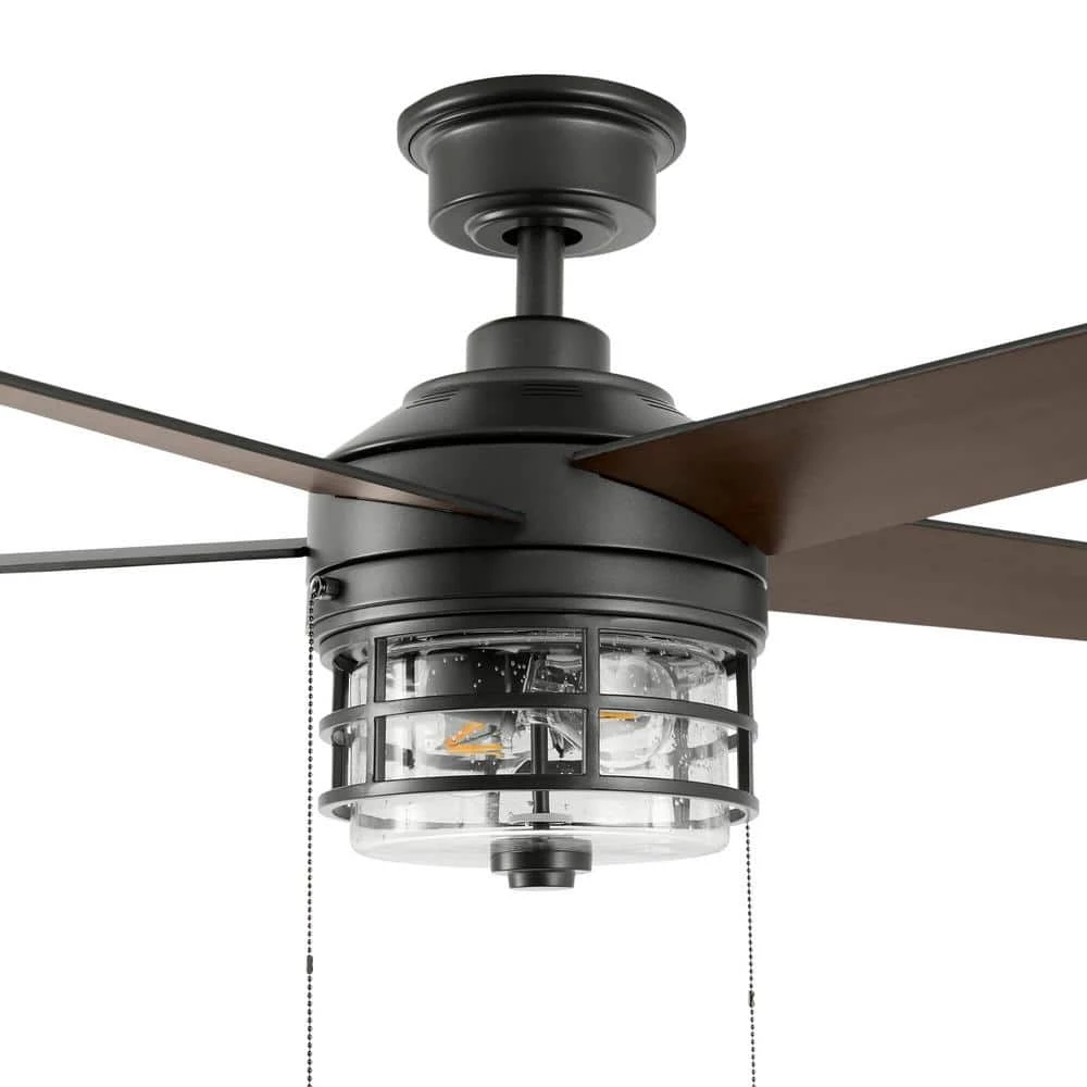 The Home Decorators Collection Colbridge 52 in. Natural Iron Ceiling Fan features 5 reversible weather-resistant matte black/Jacobean walnut blades and a natural iron finish that looks great in either an indoor or outdoor setting. Features an optional 3-speed control with reverse setting and the damp-rated housing allows for covered outdoor use. Uses two 7.5-Watt LED bulbs (included).