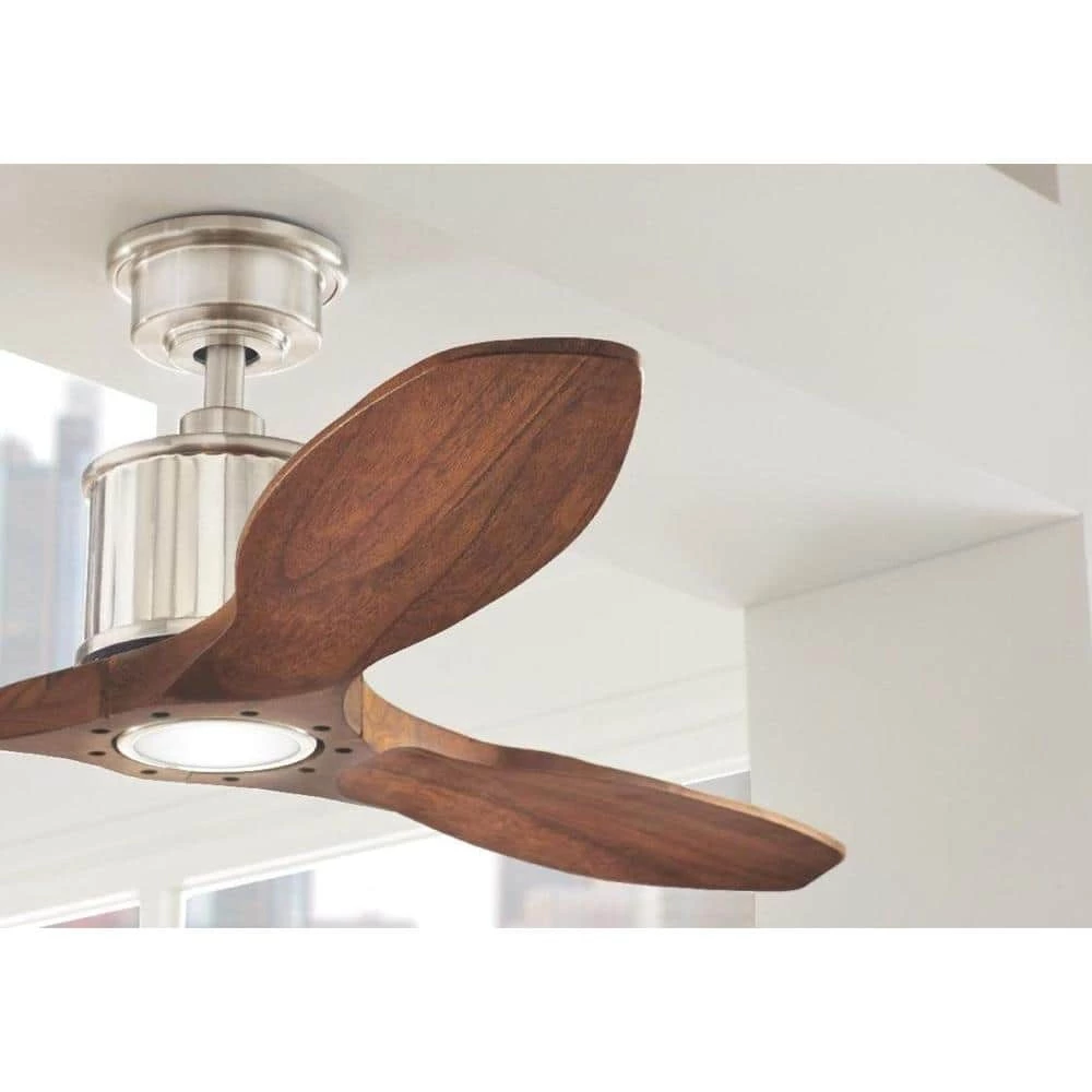 The Reagan II 52 in. brushed nickel ceiling fan has a unique design with its real wood cherry blades. This fan is perfect for modern open spaces and will attract much attention due to its style. Also included is a 16-Watt LED light source that is energy efficient as well as dimmable. The included remote control operates both the light and speed of the fan. This fan comes with a lifetime motor warranty.