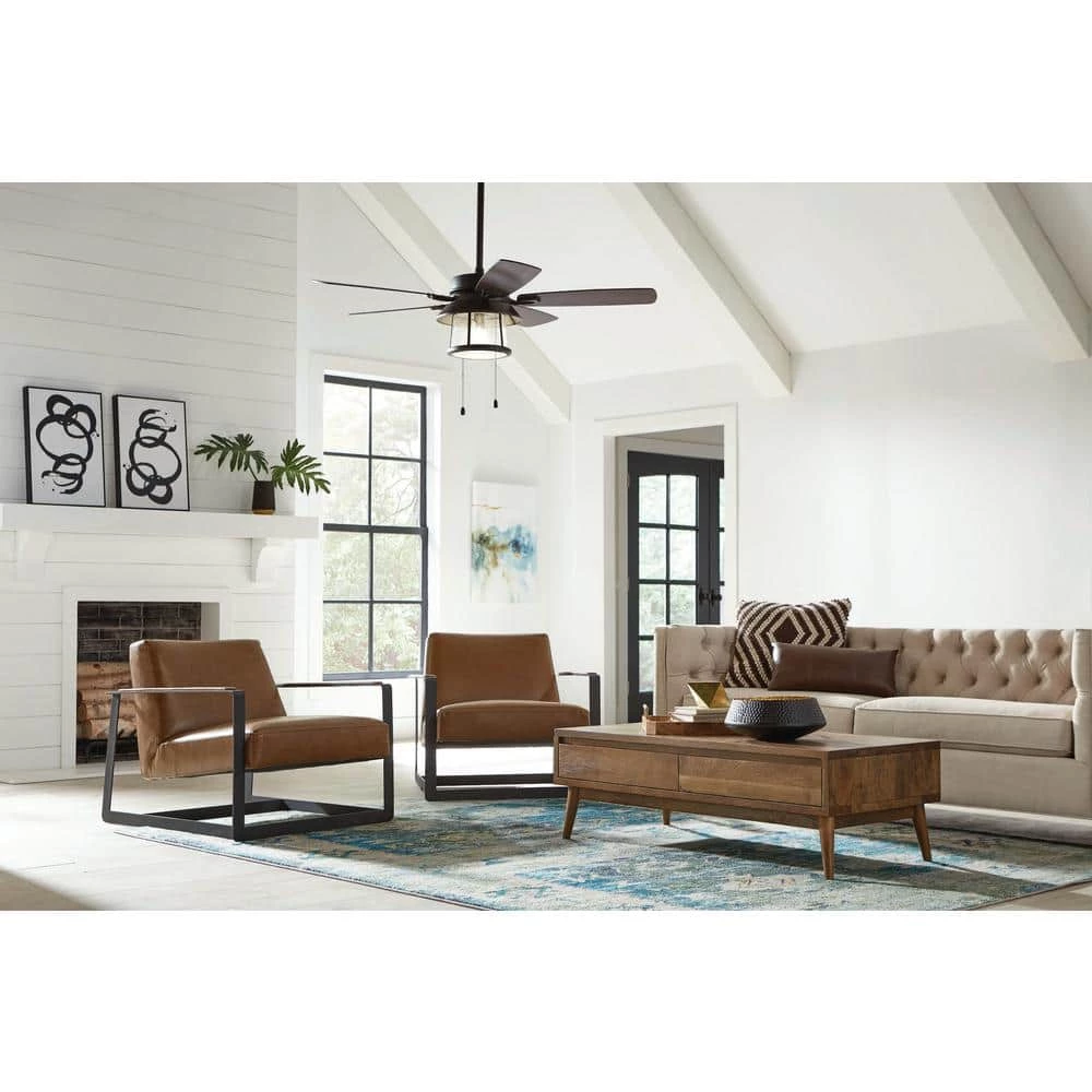 Enhance your outdoor living space with the Home Decorators Collection 52 in. Shanahan ceiling fan. Perfect for use indoors or covered outdoor locations like porches and patios, this damp rated fan features a seeded glass light kit that uses one 6.5-Watt LED bulb (included). The powerful and quiet 3-speed reversible motor is easily controlled via the included pull chains. Installation is a breeze with included features like AccuArm blade arms and a slide-on mounting bracket. The rich, bronze finish is complemented by five reversible blades in weathered oak and dark oak finishes.