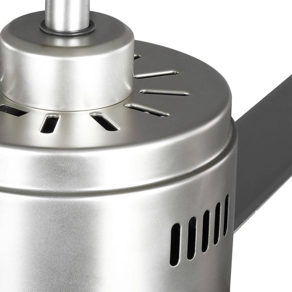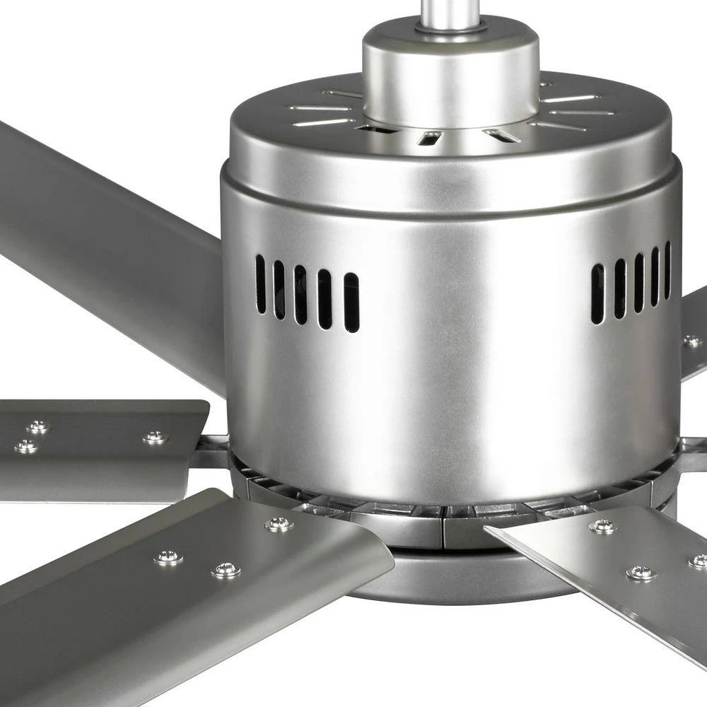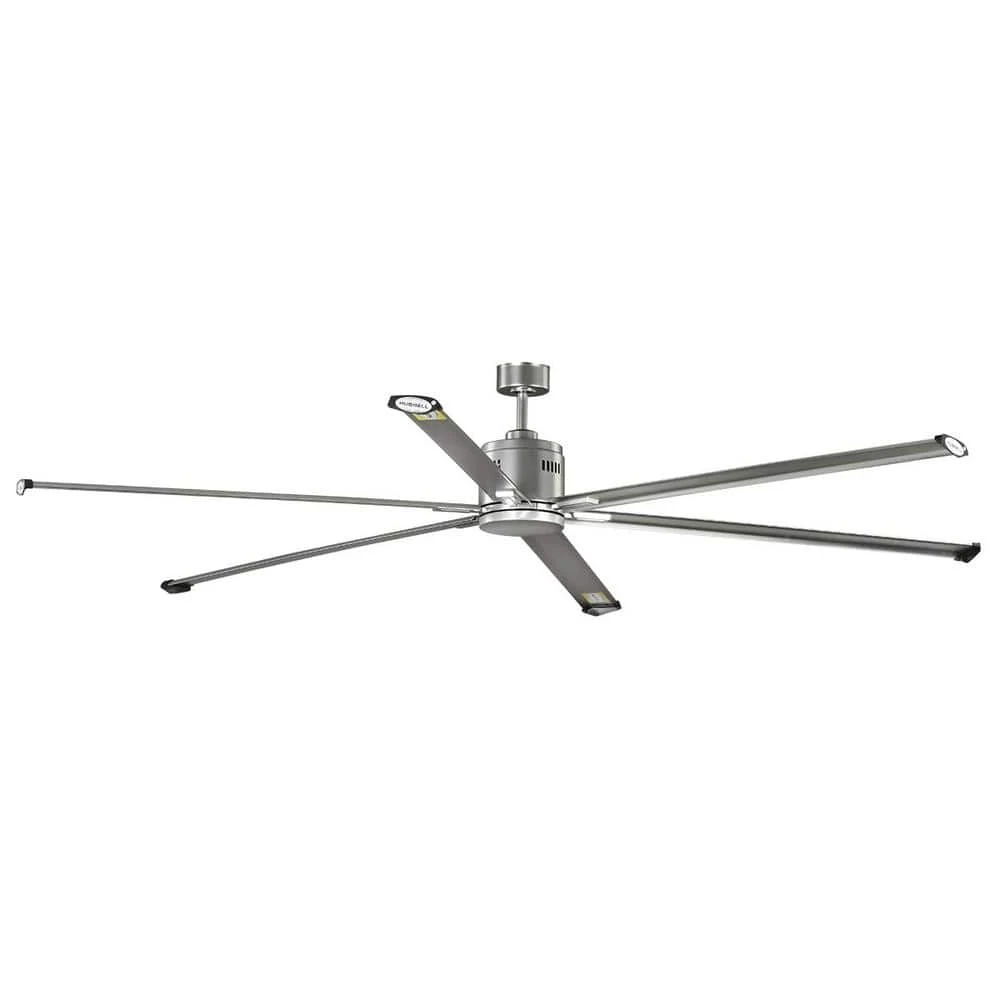 Beautiful and expansive in design, the 96 in. Hubbell Industrial ceiling fan is ideal for use in large areas and outdoor covered areas for maximum cooling. Finished in Nickel and with color-matched blades. This fan featuring an energy efficient 6-speed reversible DC motor. Damp location listed for covered outdoor areas. A full function wall control with batteries is included.