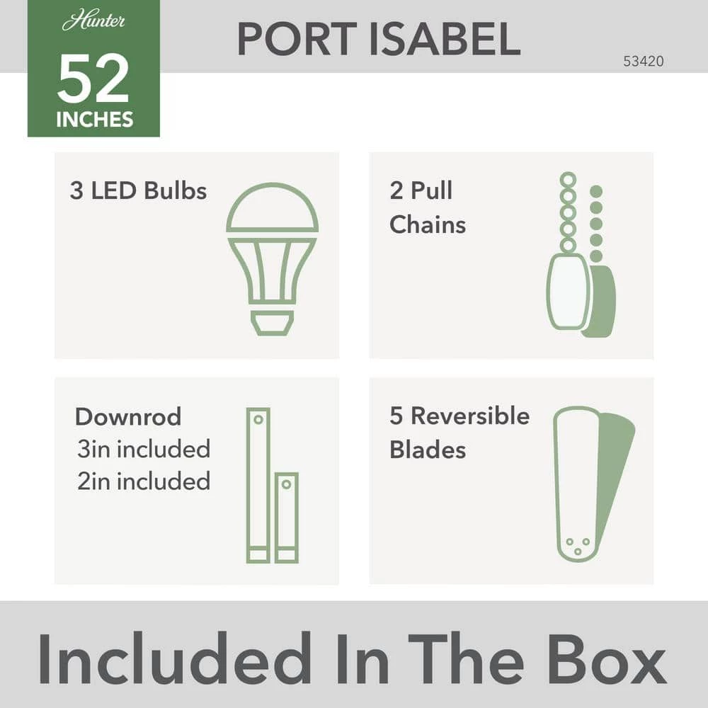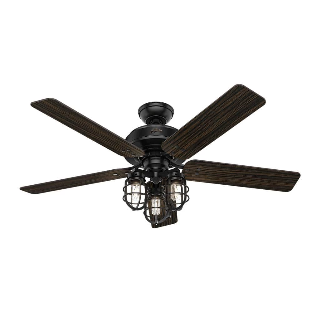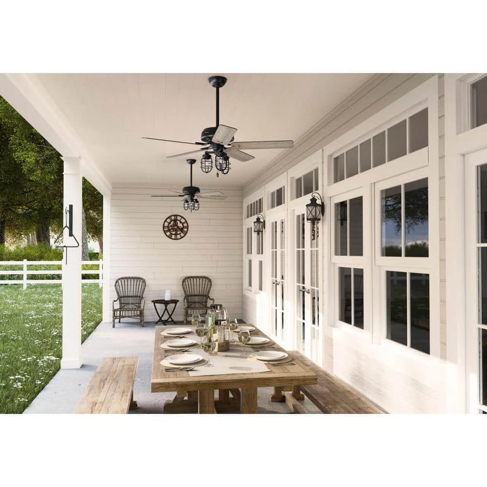 The Port Isabel outdoor ceiling fan features a stylish light fixture and rustic finishes for a look that creates the perfect centerpiece on your covered porches and patios. The industrial inspired caged light fixture is at home in nautical and coastal spaces as well as modern industrial or farmhouse style rooms. Easily control this ceiling fan with LED light with the included pull chains. The Port Isabel fan is damp rated for use in covered spaces exposed to moisture and humidity including patios as well as bathrooms and garages.