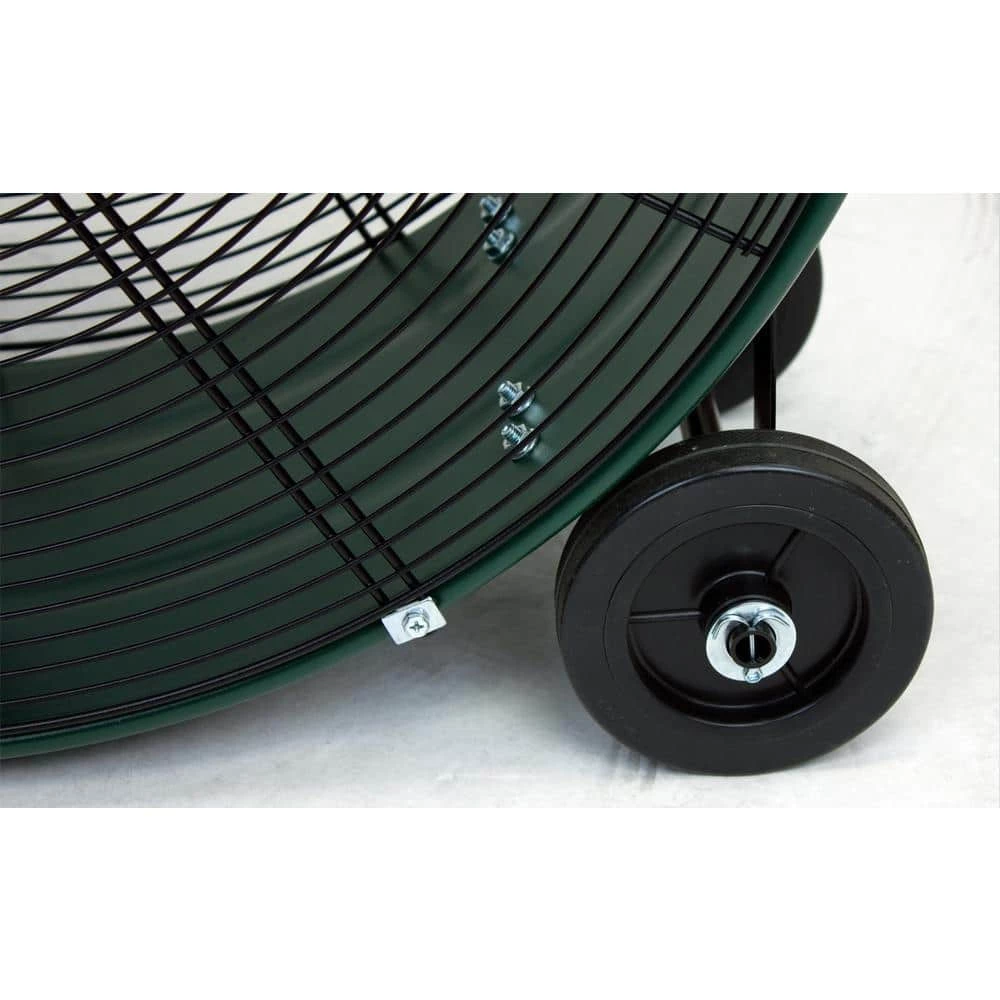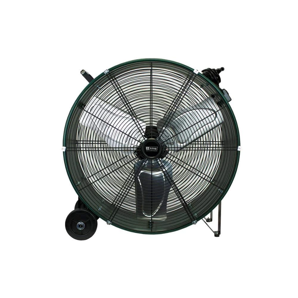 King High Velocity Direct Drive Drum Fans are great for heavy duty air circulation in light duty commercial applications where an economical solution is needed. They are dependable, running on less power and require less maintenance compared to other motors. The 2-speed, direct drive fan has 3 aerodynamically balanced aluminum blades for even, steady airflow and to provide maximum airflow and motor efficiency. The scratch-resistant King green finish looks sharp and is easy to clean. Rugged flat-free wheels with metal hubs last for-years and roll easily over uneven surfaces. Cord wrap for convenient storage. UL listed.