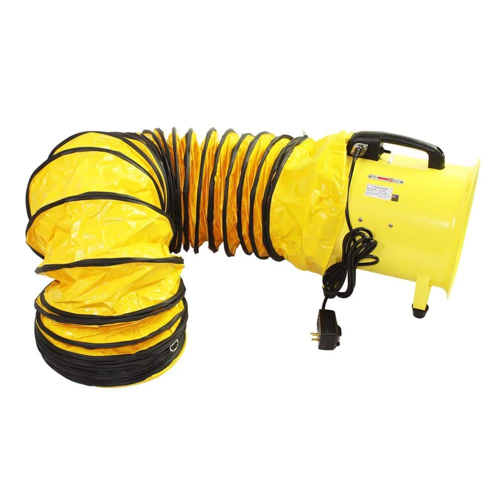 Our Maxx Air confined space blower fan provides directional airflow in limited access areas such as a basement, crawl space, or attic. The 20 ft. flexible polyvinyl hose attaches to the utility fan’s flared housing via cinch strap for a secure and easy setup, pushing fresh air into a space or exhausting air outwards (even off the ground using the pre-installed hanger rings on the hose) to create a safer working environment. Utilize this portable fan’s heavy duty carry handle to transport it to your job, and set it down on it’s positioning legs with thick rubber feet designed to minimize noise and reduce vibration.