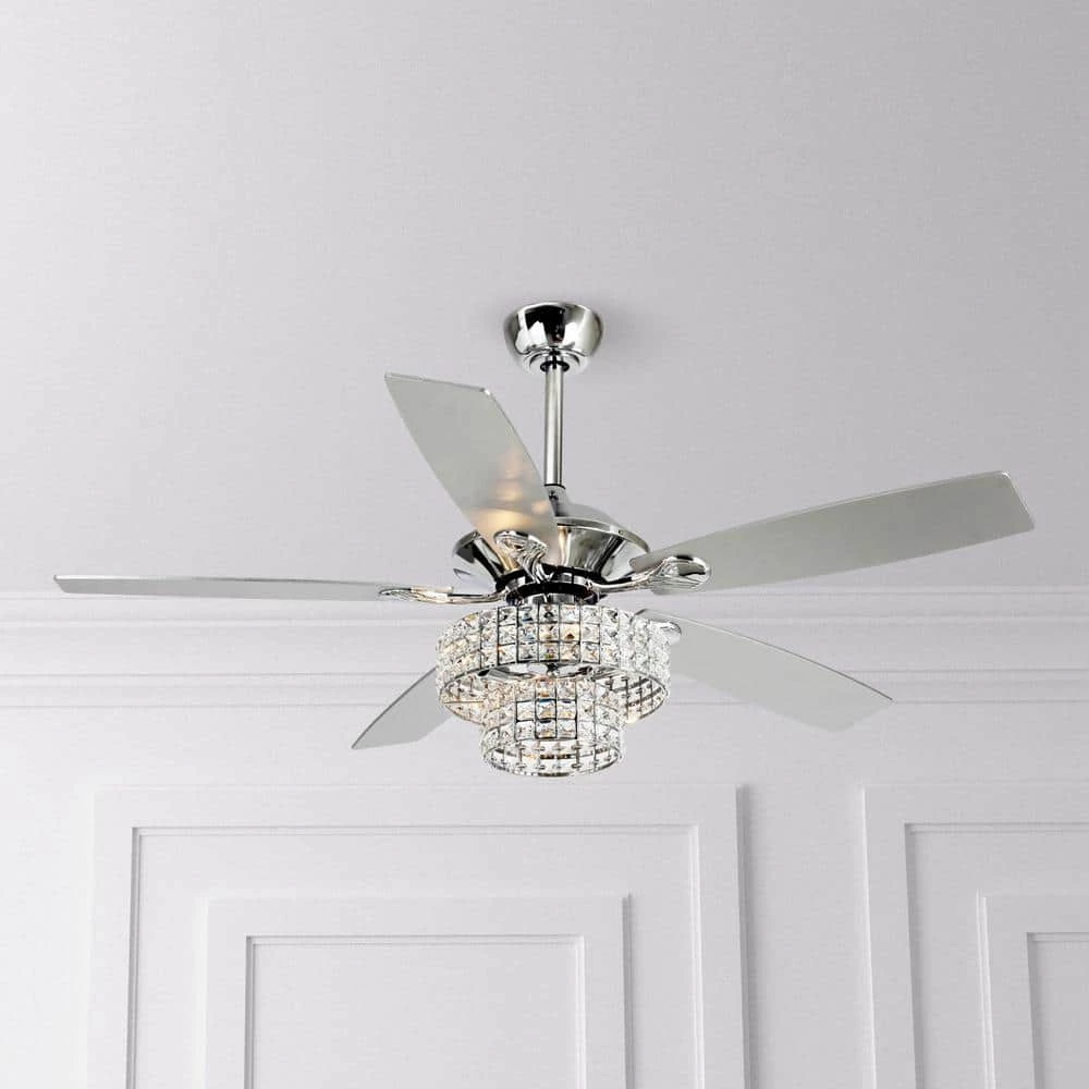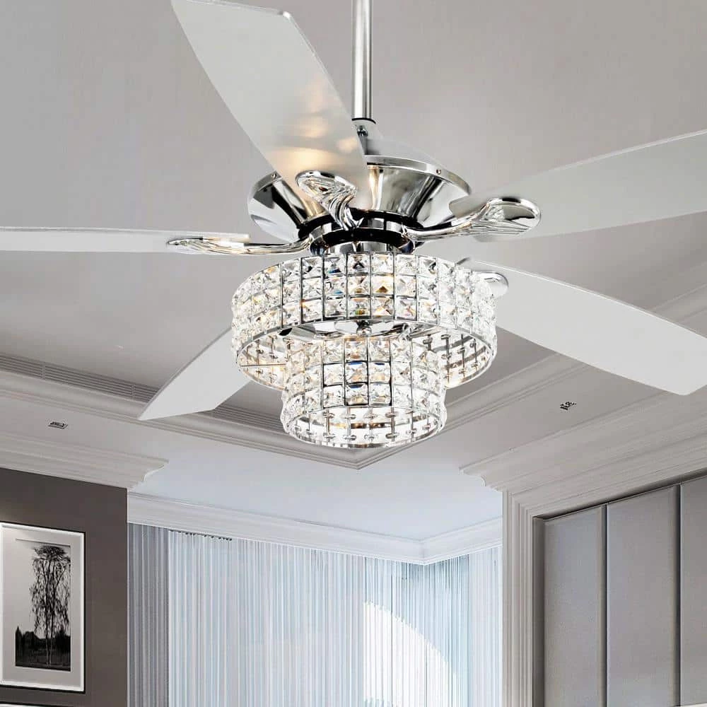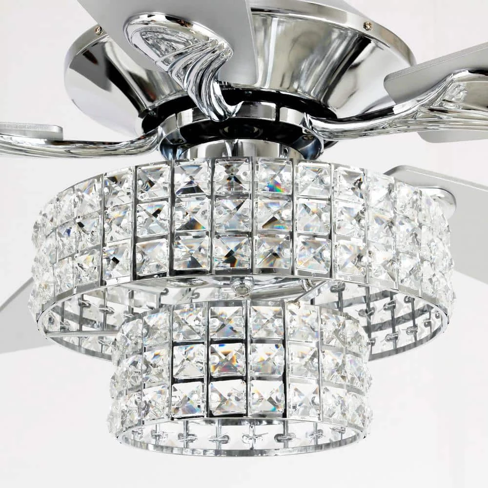 Beautiful crystal chandelier ceiling fan with lights work with high-quality mechanical elements coalesces into an elegant lighted ceiling fan. The shade is two-tiered with crystal embedded stamped metal walls. The richly traditional design is meant to compliment any luxurious space.