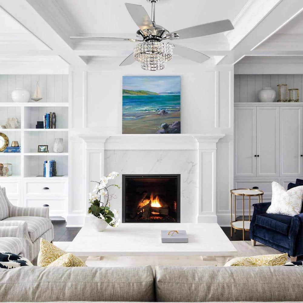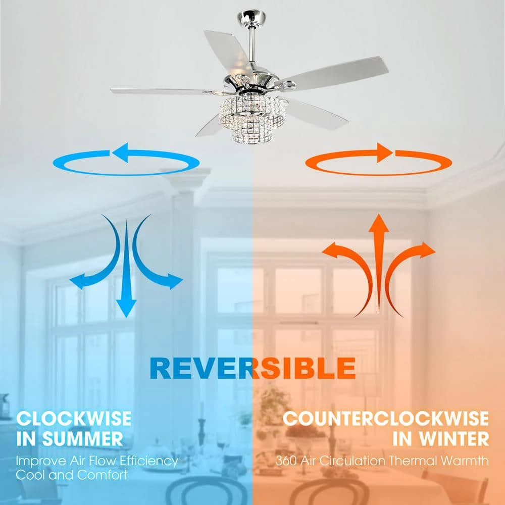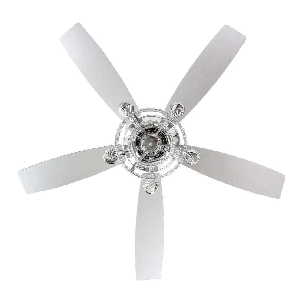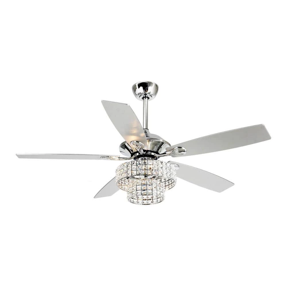 Beautiful crystal chandelier ceiling fan with lights work with high-quality mechanical elements coalesces into an elegant lighted ceiling fan. The shade is two-tiered with crystal embedded stamped metal walls. The richly traditional design is meant to compliment any luxurious space.
