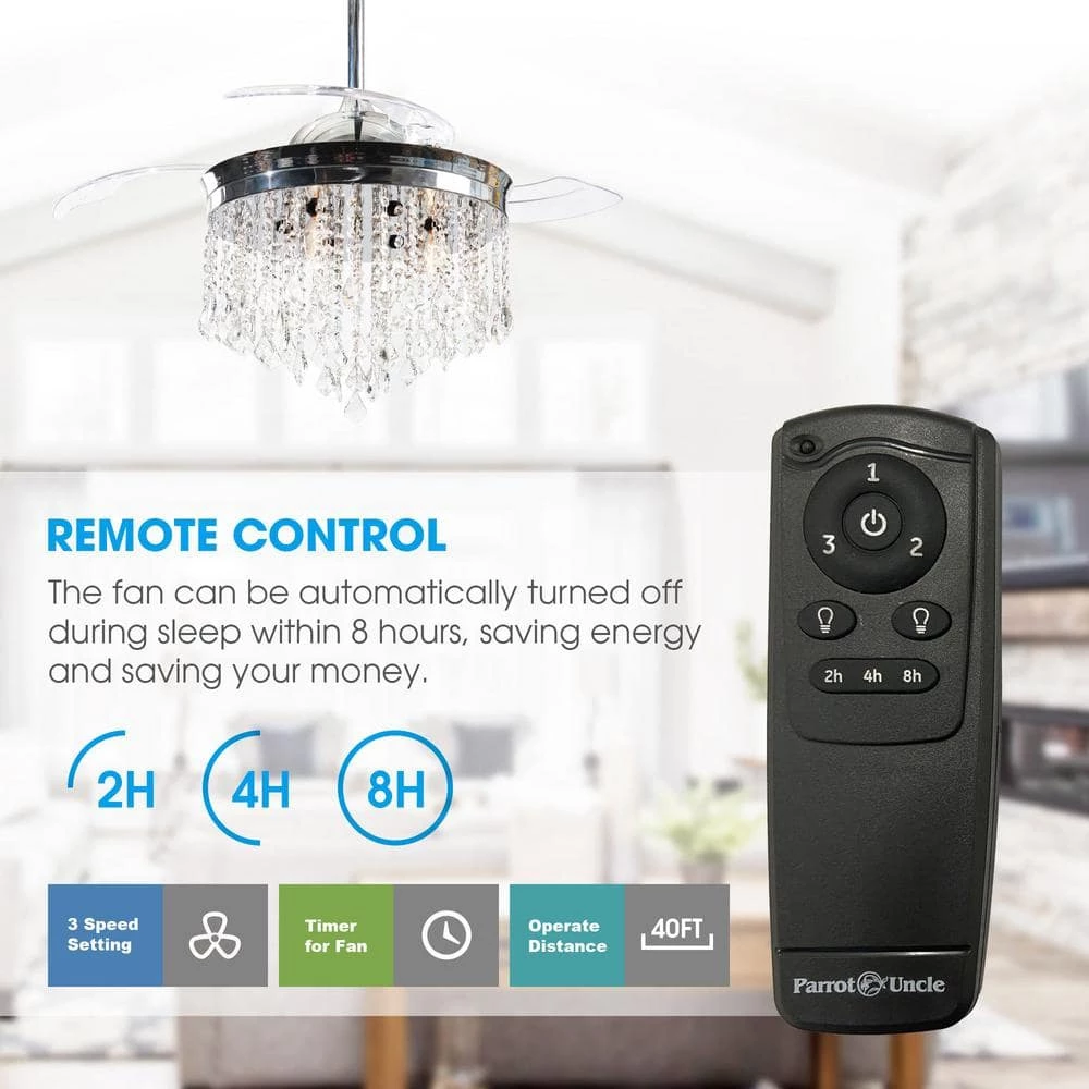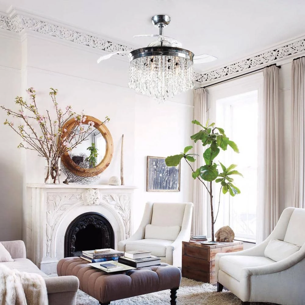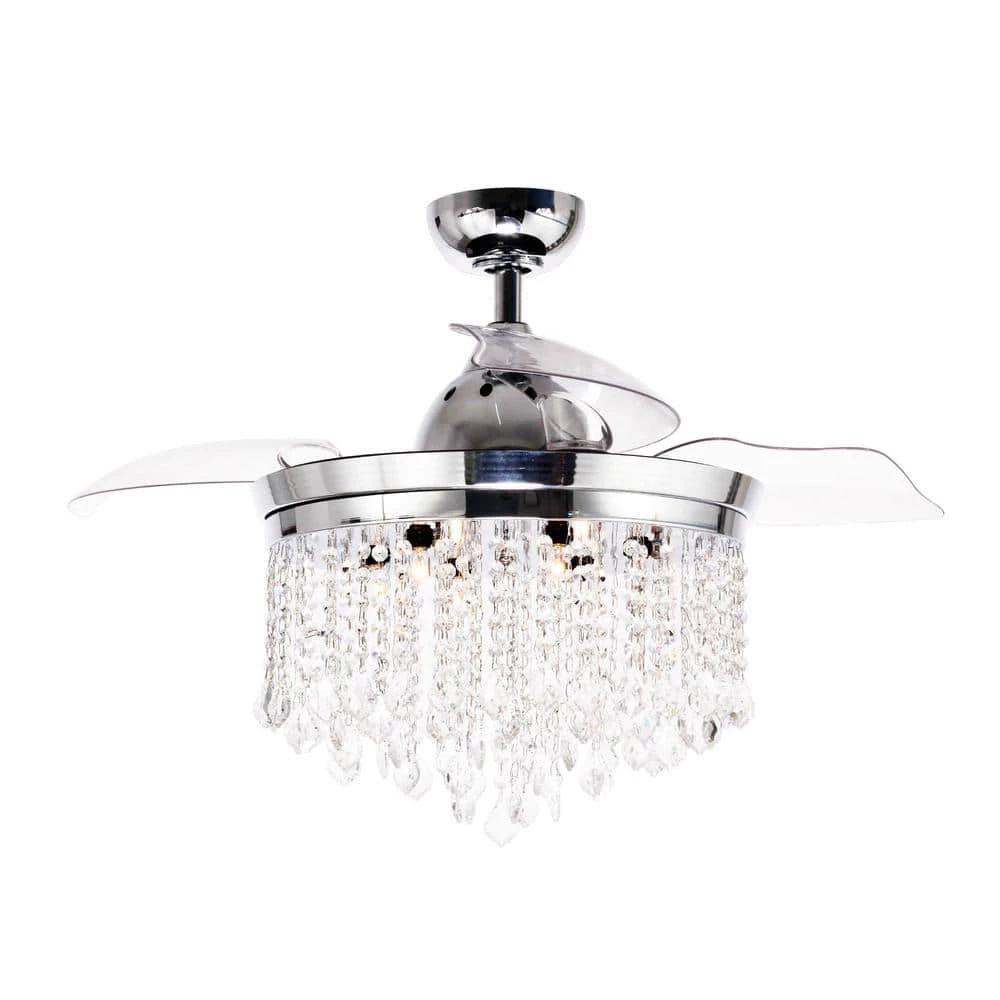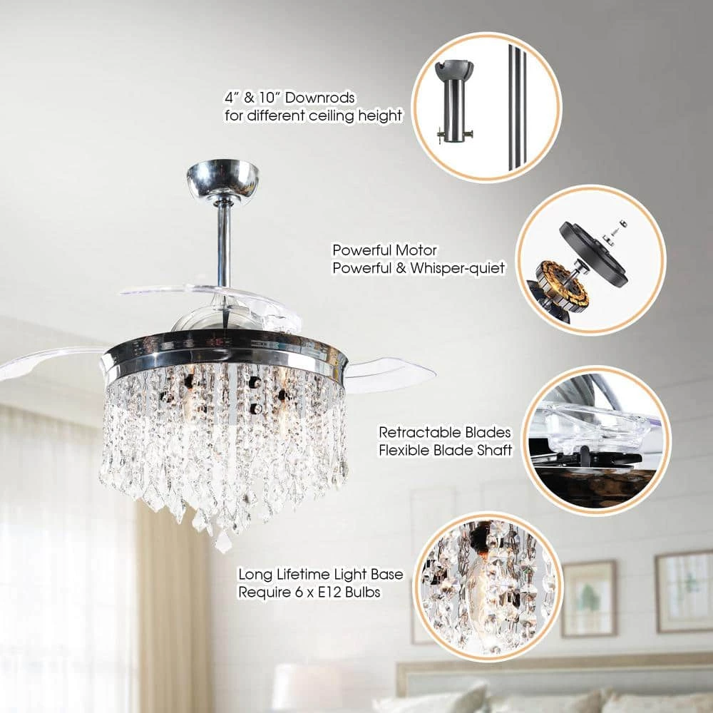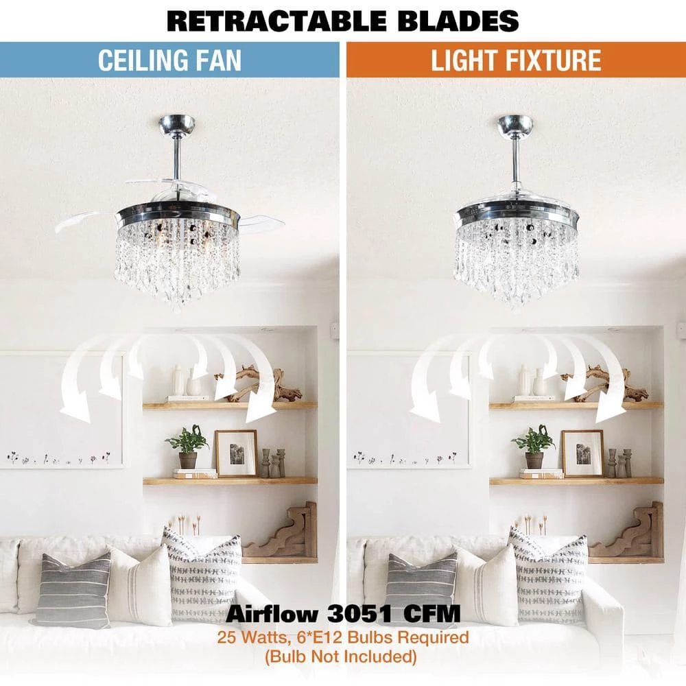 It is a combination of a retractable ceiling fan and crystal chandelier. When switched off, the intrusive fan blades automatically retract and conceal, and visually the unit transforms into a slim, modern chandelier. This high-end remote control allows you to control the light and the 3 fan speed separately.