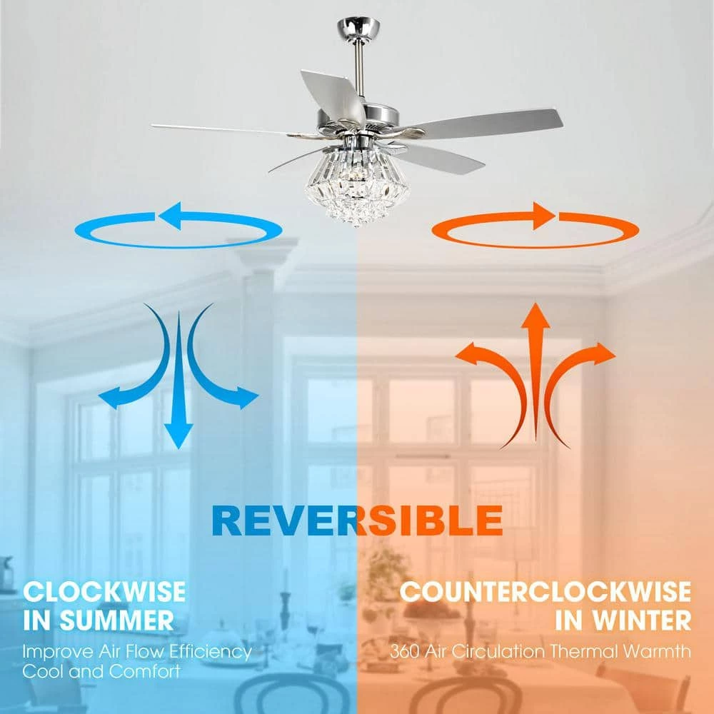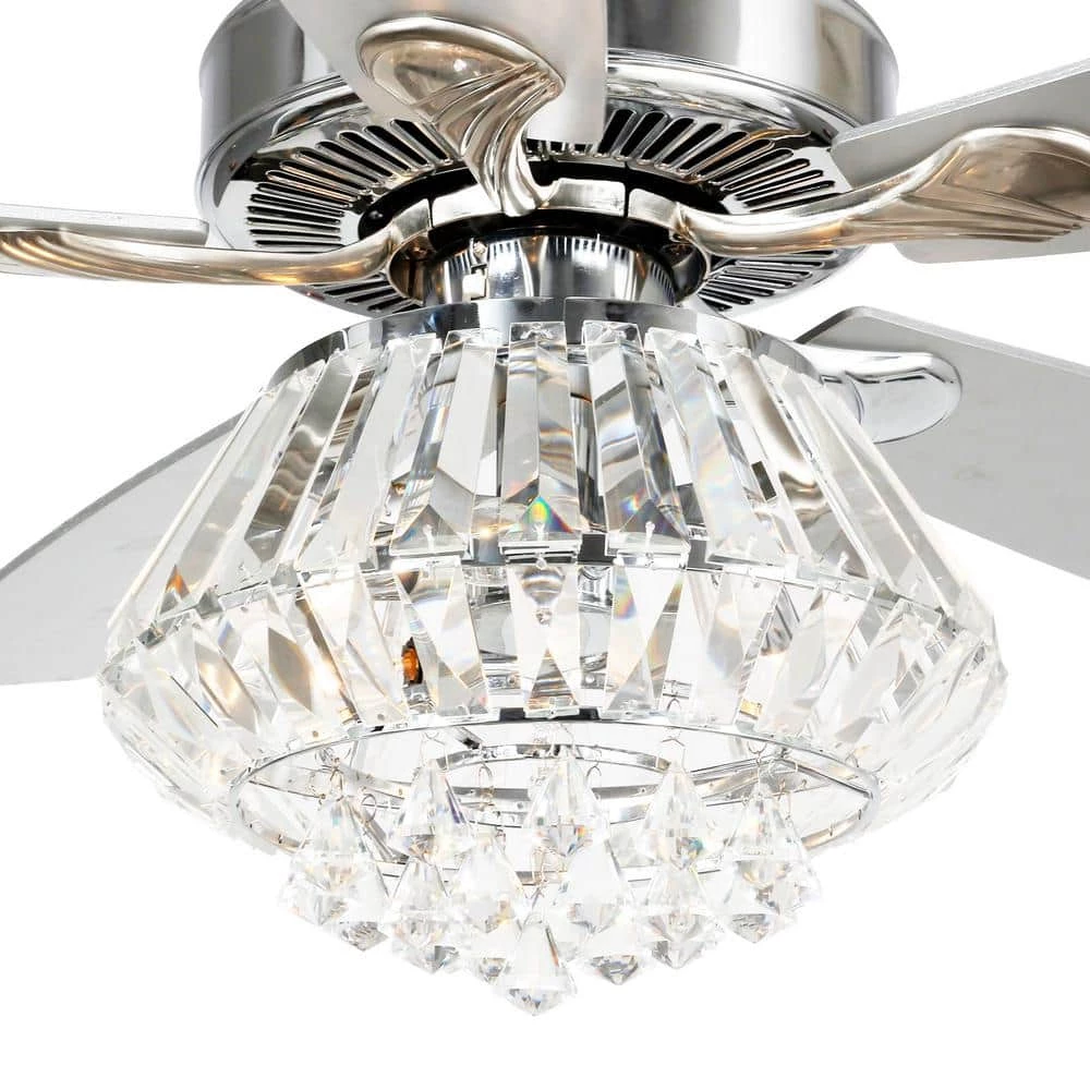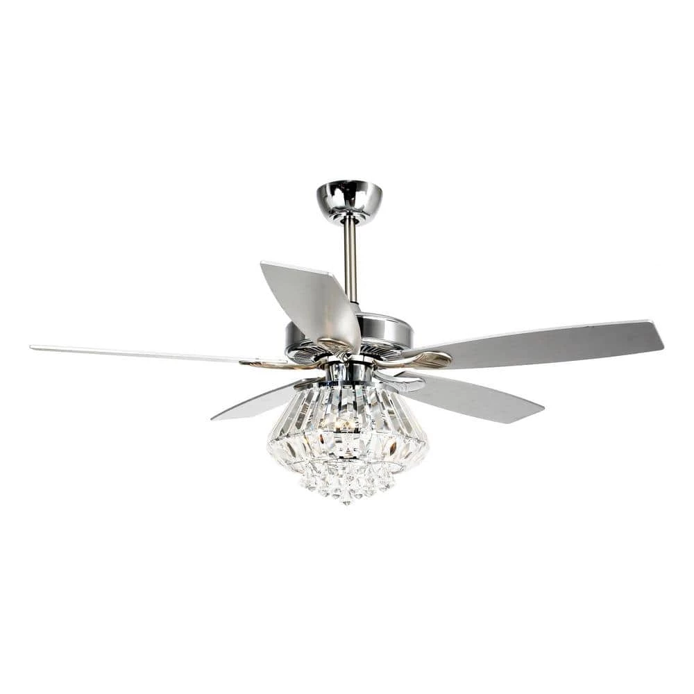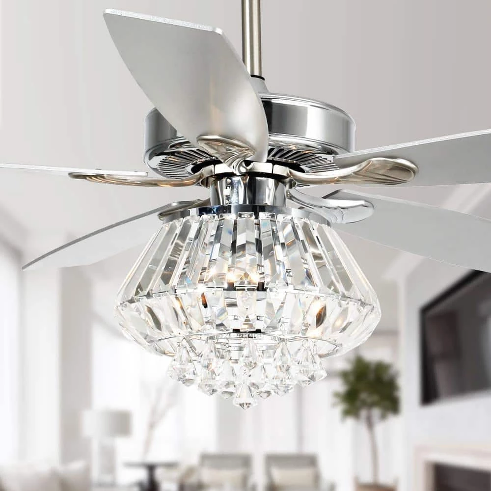 These crystal chandelier ceiling fan with lights are the most cost-efficient option for bringing the temperature down and moving stale air out of your room. This lighted chandelier ceiling fan is the perfect solution for your cooling and lighting needs. A full crystal shade combines to fill your home with a grandeur rarely found in such a functional package. The matching silver stained wooden blades move an impressive amount of air. The 3-speed motor ensures you find the exact setting for your stimulating comfort.