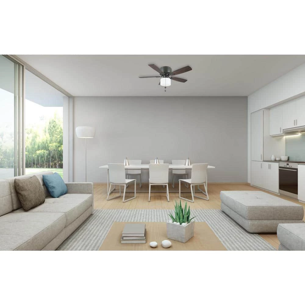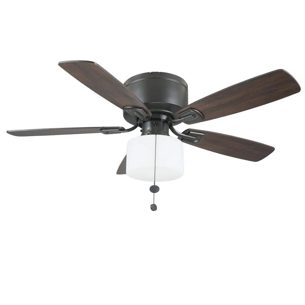 The 42 in. ceiling fan with light kit included features a 3 speed motor with pull-chain operation. The motor is reversible with the flick of a switch for all-season use, while the fan blades are reversible to suit your existing decor and tastes. This model is available with an oil-rubbed bronze finish as well as brushed nickel and either version comes with a distinctive opal white glass shade and 9-Watt LED bulb included. The flush mount design allows for simple installation without the need for a downrod. This is an indoor ceiling fan and we recommend it for use in smaller rooms of up to 10 in. x 10 in. in size.