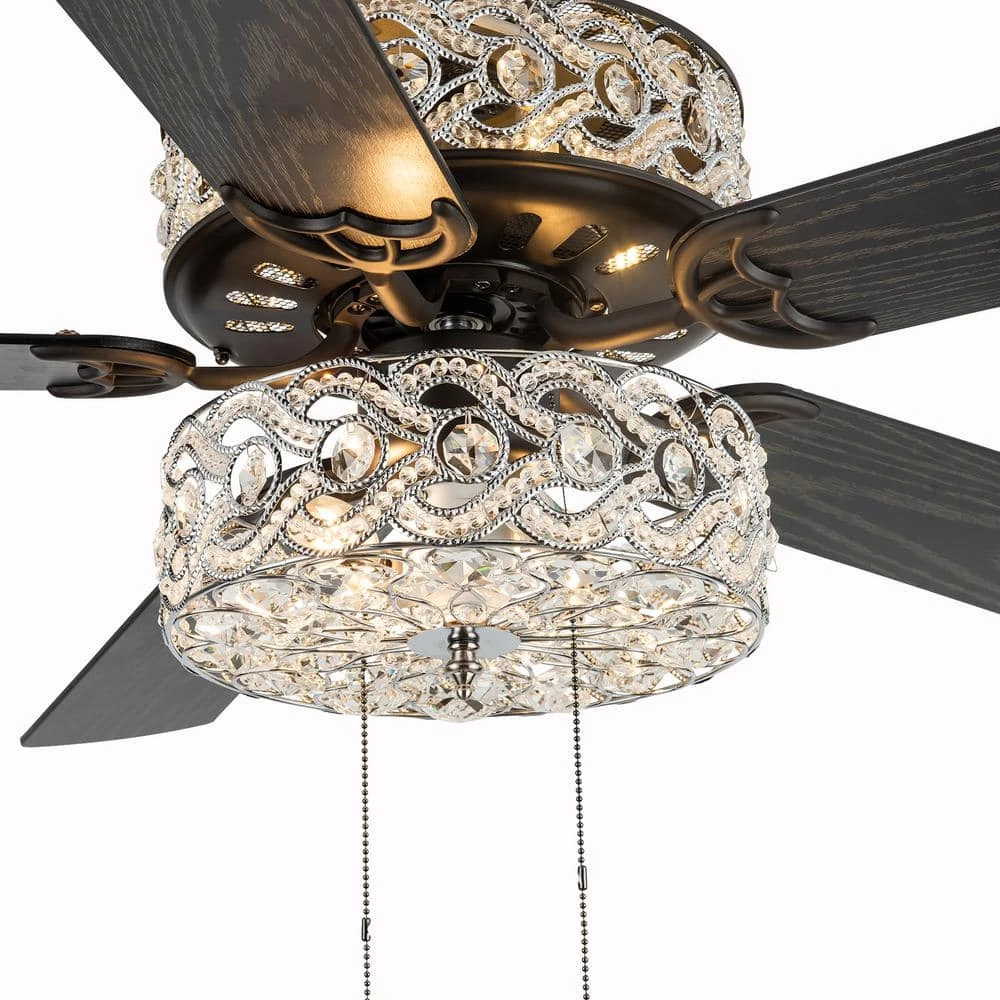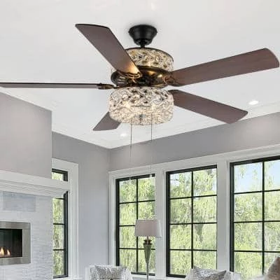 Olivia is a dramatic satin nickel double-lit chandelier ceiling fan designed with woven clear faceted K-9 crystals. Illuminate your room in style with this satin nickel and clear glass ceiling fan. Two (2) dimmable E12 LED 6W/40W incandescent equivalent and Four (4) dimmable E12 LED 1W/15W incandescent equivalent warm white light bulbs (included) illuminate the 76 glass crystals. Use a cool bulb if brighter white ambiance is preferred. Five (5) wood grain textured blades allow for maximum air movement and are reversible. One side features a traditional mahogany finish, while the opposite side features a sleek, antique black finish. A 12″ pull chain switches allows for manual power off/on, light operation, and three-speed motor (reversible). Installation options included: overall height is 15.25″ (flush mount), 18.25″ (down rod), 35.25″ (long down rod). This item must be hardwired and installed by a qualified electrician.
