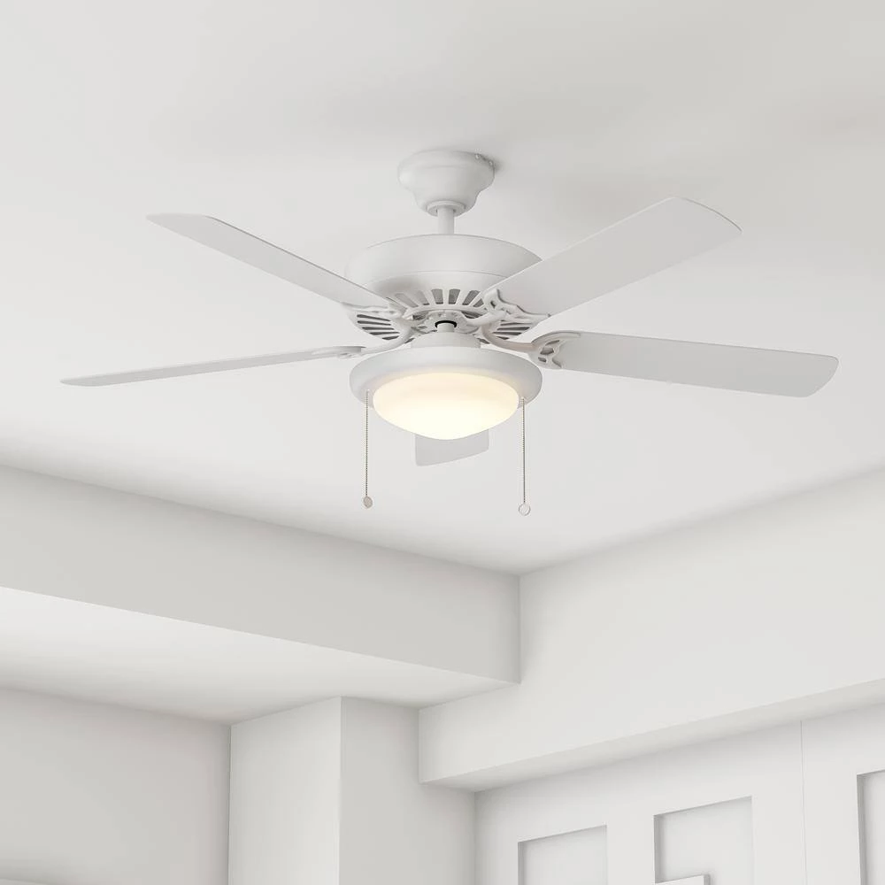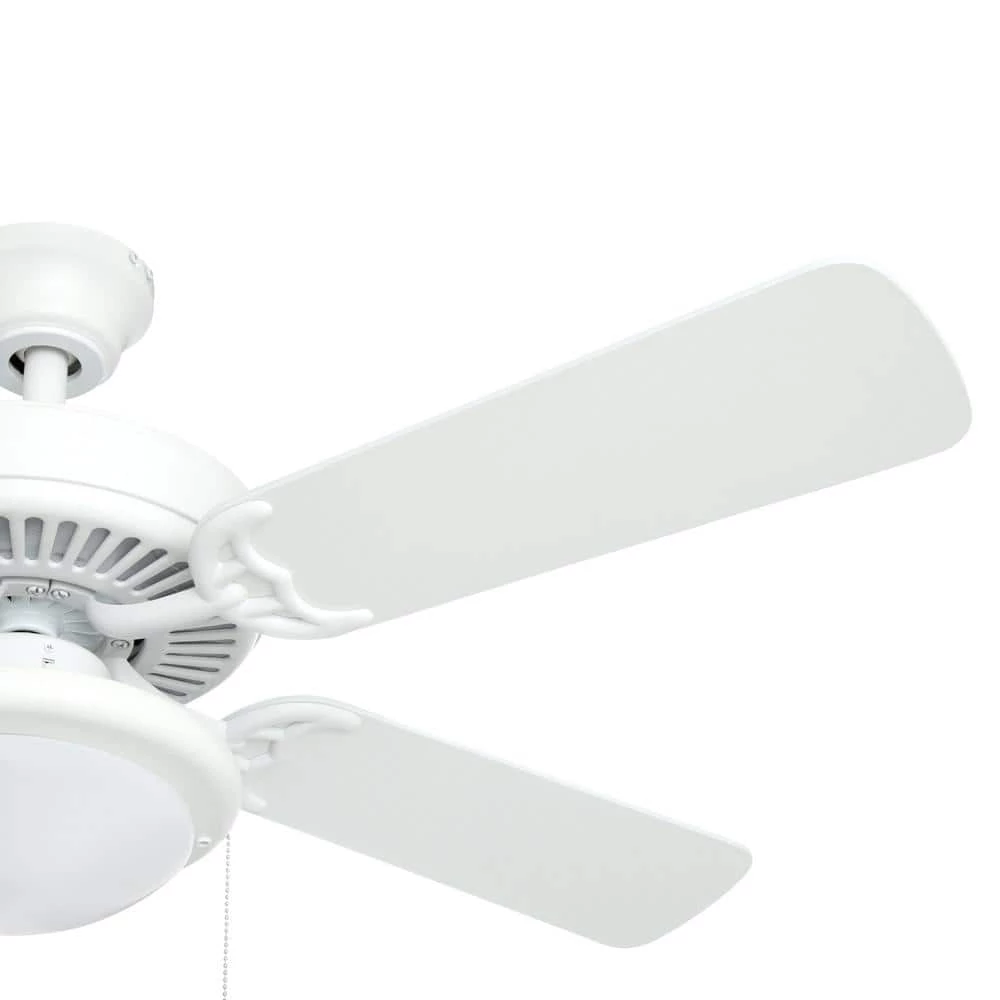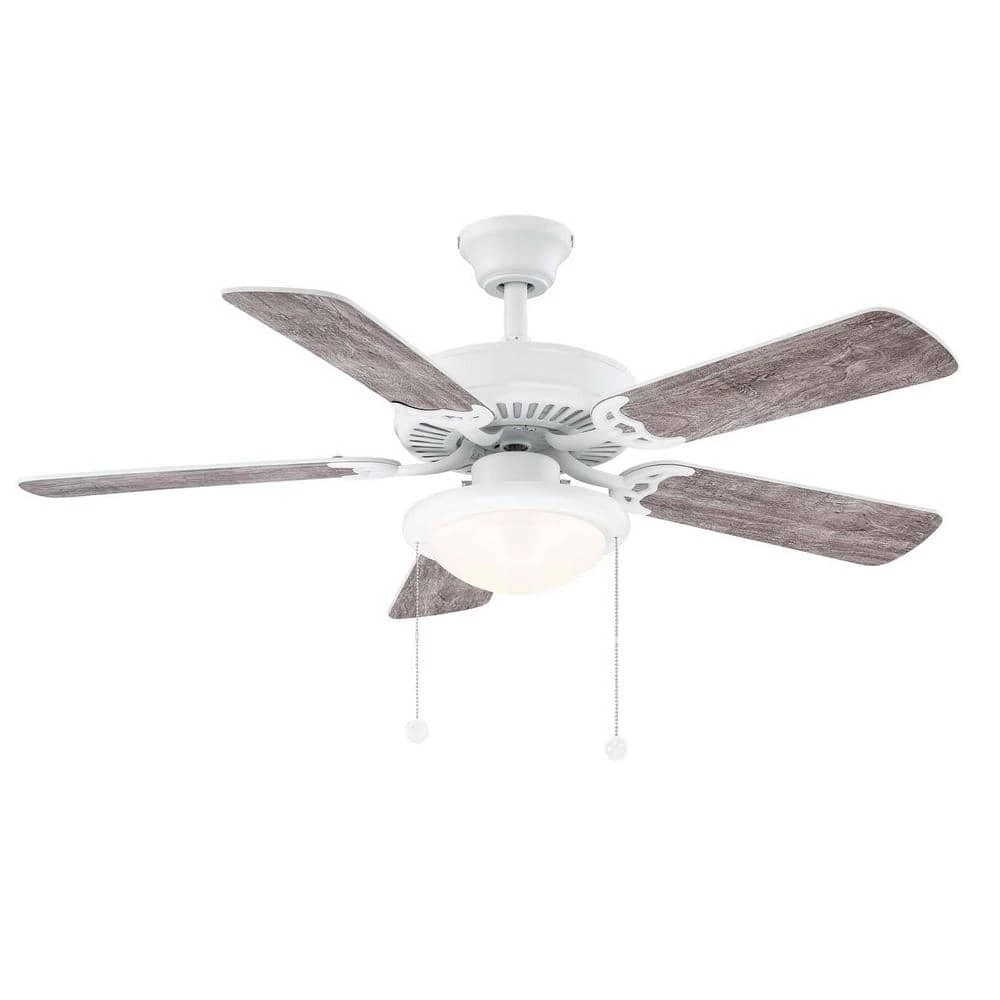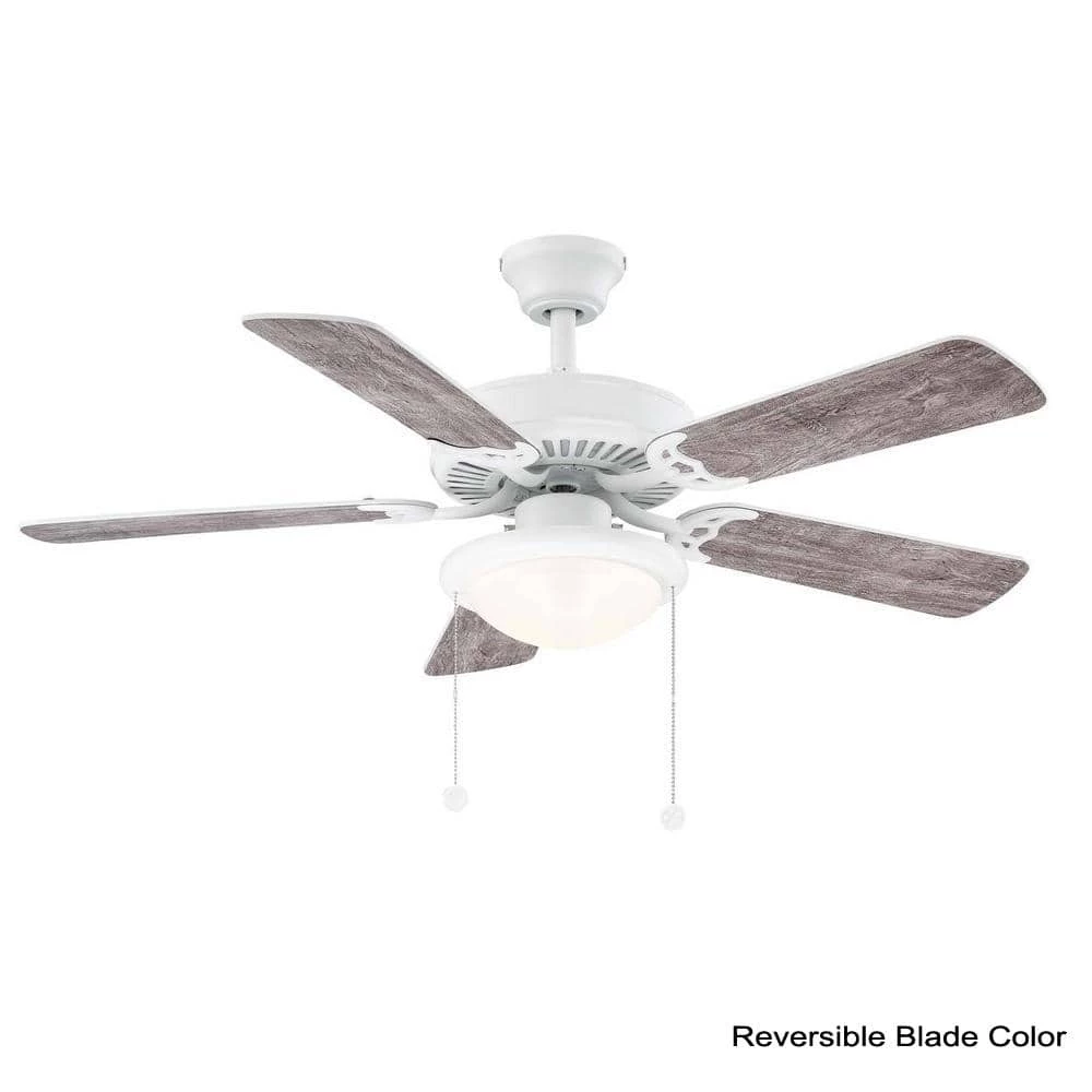 Providing your space with attractive illumination, the Hampton Bay Trice 44 in. Matte White Ceiling Fan brings transitional and sophisticated styling to your decor. Boasting a frosted-opal schoolhouse light fixture, this fan has five reversible fan blades with a distressed gray and white finish. It features three speeds for optimal and custom air circulation and uses one 9-watt LED bulb.