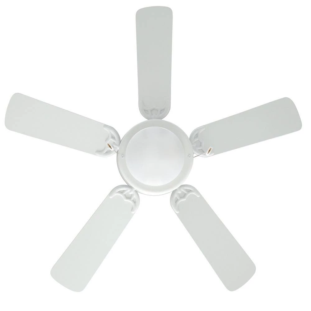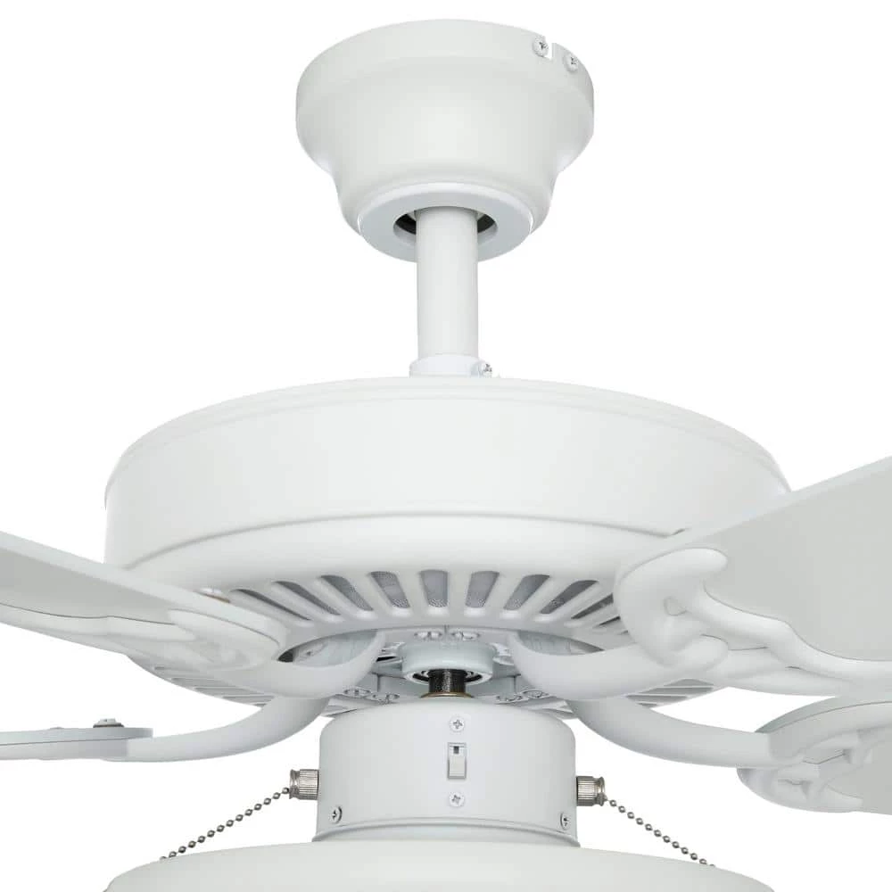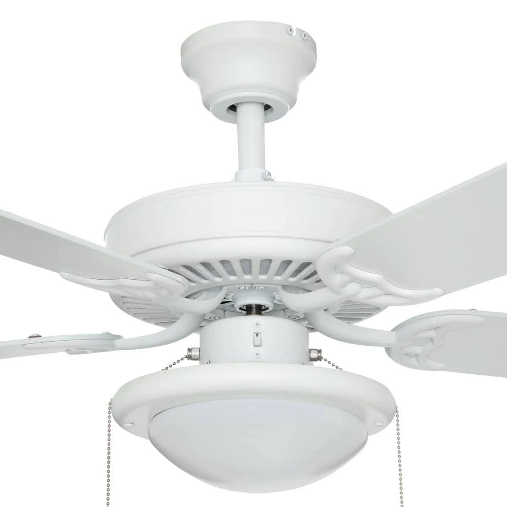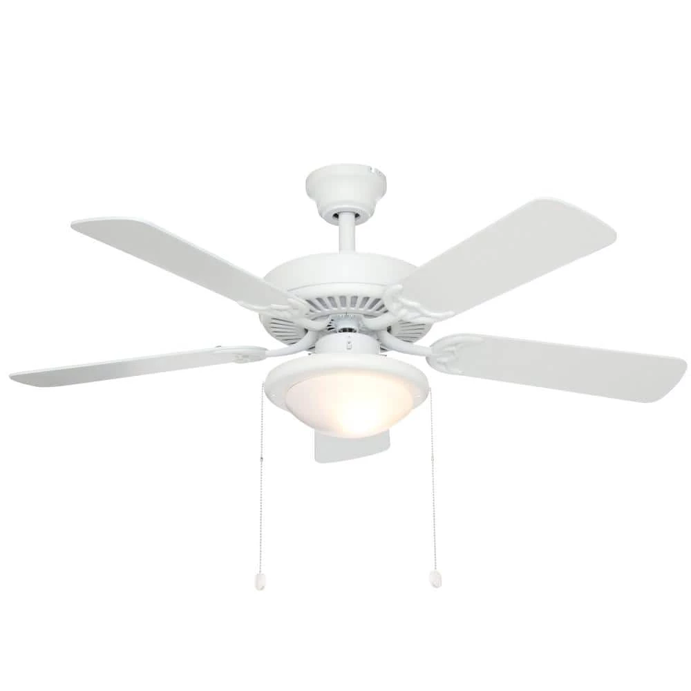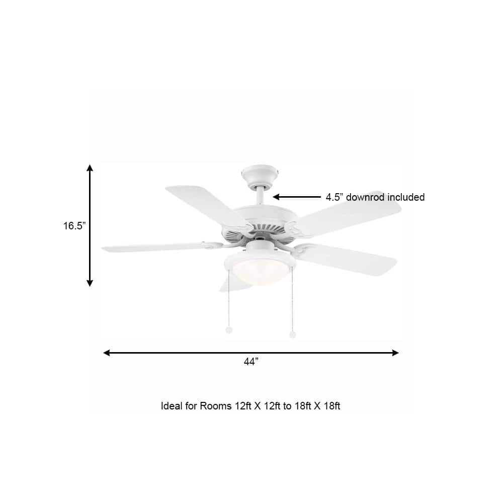 Providing your space with attractive illumination, the Hampton Bay Trice 44 in. Matte White Ceiling Fan brings transitional and sophisticated styling to your decor. Boasting a frosted-opal schoolhouse light fixture, this fan has five reversible fan blades with a distressed gray and white finish. It features three speeds for optimal and custom air circulation and uses one 9-watt LED bulb.